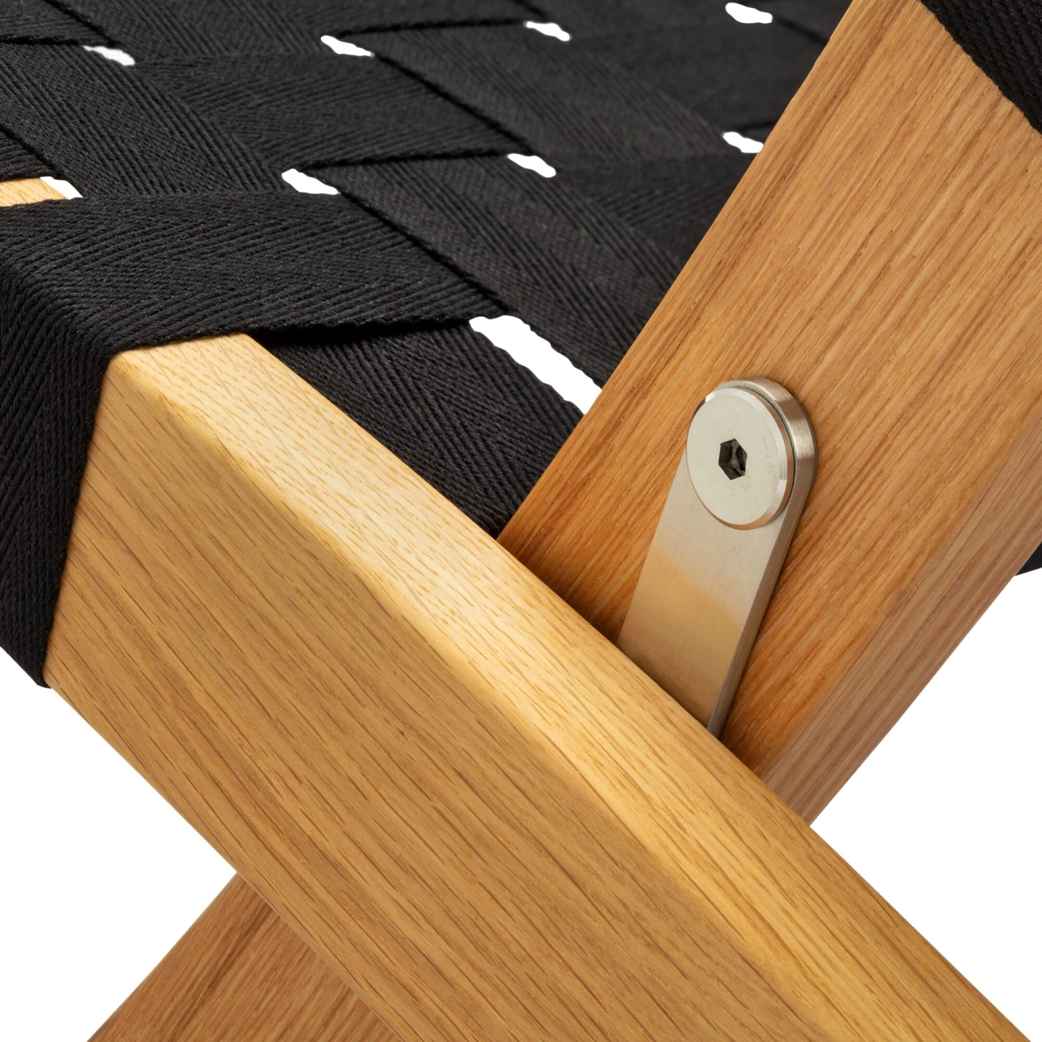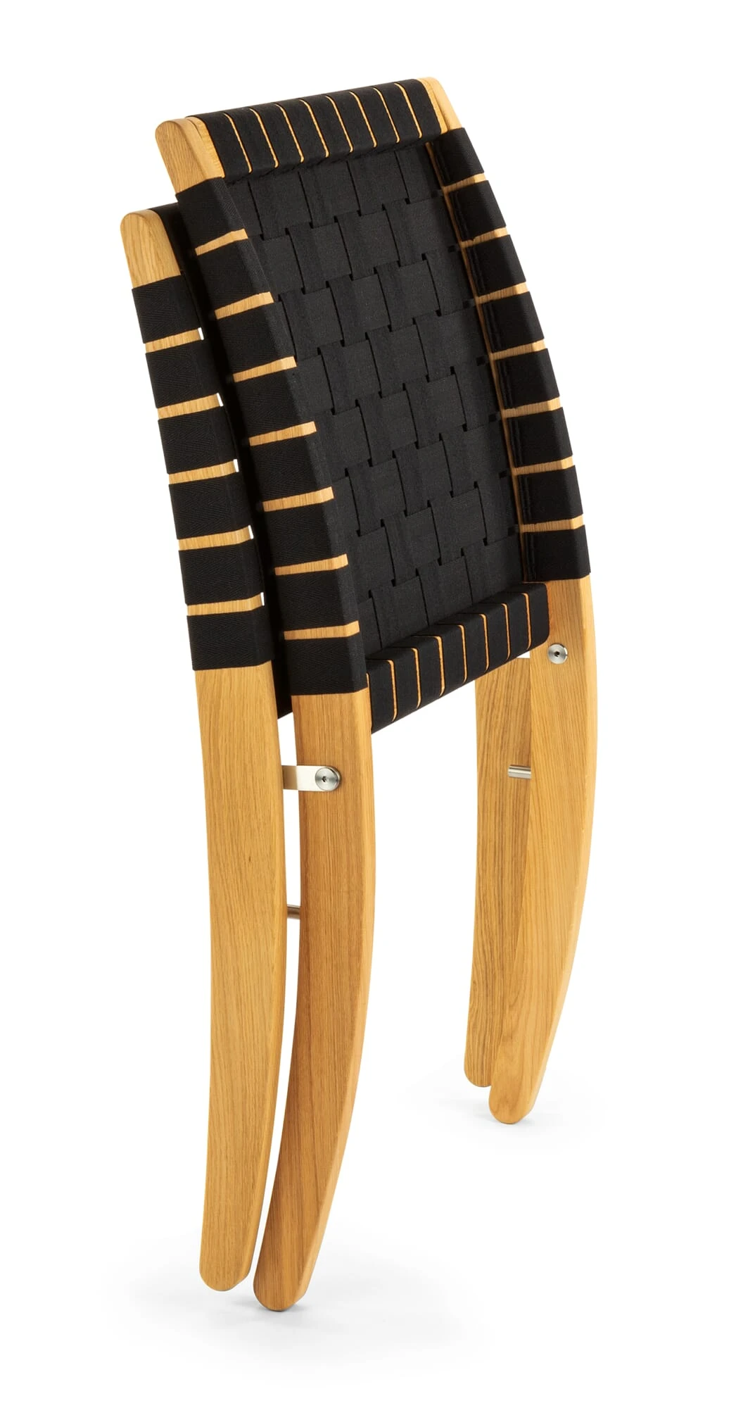 Eikenhout (herkomst Denemarken), geolied. Riemen katoen PP stof. Roestvrij stalen fittingen. Gemaakt in Denemarken. Hoogte 75,5 cm, breedte 61 cm, diepte 79 cm. Zithoogte voorzijde 39 cm, zitdiepte 41,5 cm. Vouwafmetingen 95,5 × 61 x 16,5 cm. Gewicht 5,7 kg.