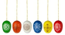 Set van 6 paaseieren (elk 3,5 × 2,5 cm) van haagbeukenhout, gekleurde lak. Goudkleurige hanger, lengte 7 cm. Totaal gewicht 48 g. Gemaakt in Duitsland.