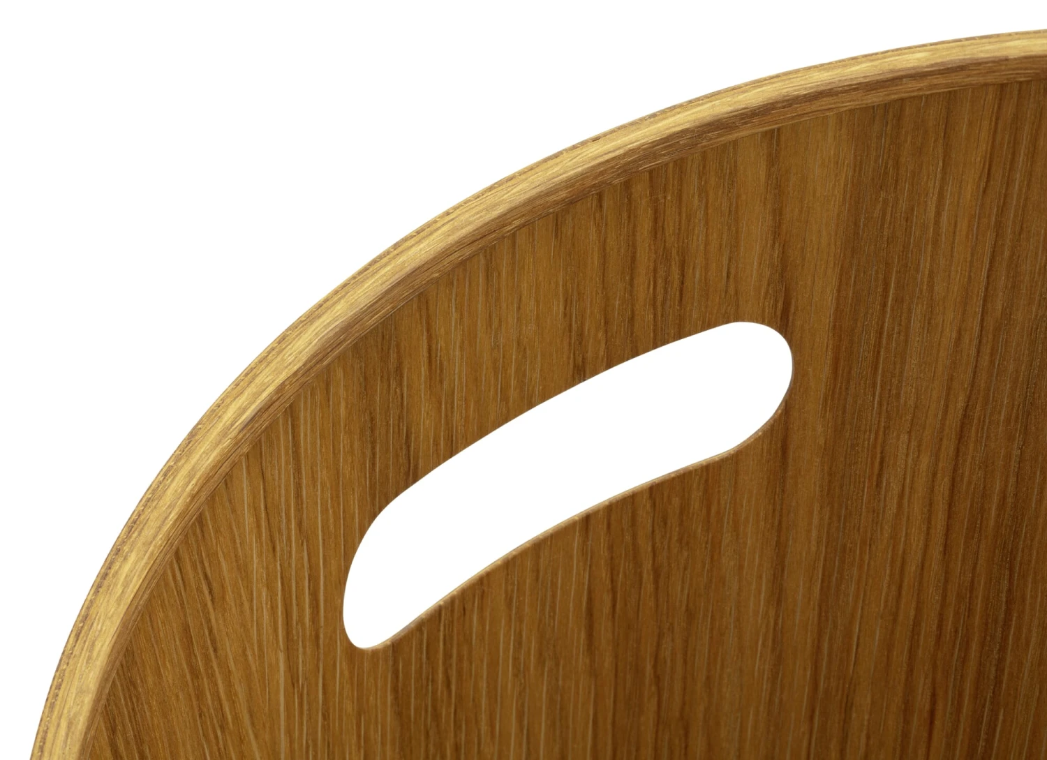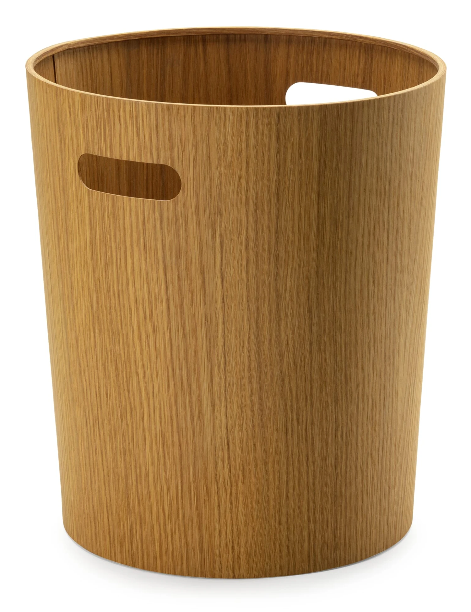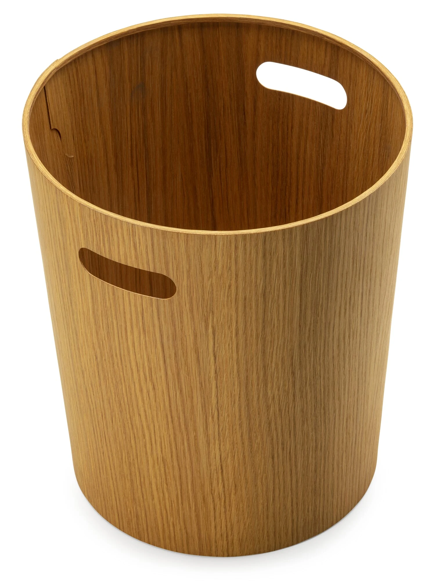 Ruime opvangbak voor weggegooide bureaupapieren, gebruikte handdoeken of zelfs voor het breiwerk naast de bank: deze mand overtuigt door zijn veelzijdige gebruik, zijn natuurlijke materialiteit en niet in de laatste plaats zijn uiterst aantrekkelijke uiterlijk. Zelfs puristen die denken in termen van materiaalbesparing komen hier aan hun trekken, want ondanks alle visuele en functionele weelde overtuigt de constructie van deze papier- en wasmand door zijn doordachte minimalisme. Een uit drie lagen bestaande fineerplaat is gebogen tot een bijna cilindrisch lichaam, dat door overlapping zijn vorm behoudt en positief op de ronde bodemplaat is gelijmd; de bovenrand is versterkt door een binnenring van drielaags hout. Bedekt met een fijn laagje blanke lak zodat de individuele nerven nog mooier uitkomen, ontstaat een stabiel lichtgewicht dat moeiteloos kan worden rondgedragen met behulp van de twee handgrepen aan de zijkant – voor het geval u deze eenvoudige schoonheid niet meer uit het oog wilt verliezen (of de handdoeken gewoon naar de wasmachine wilt brengen).