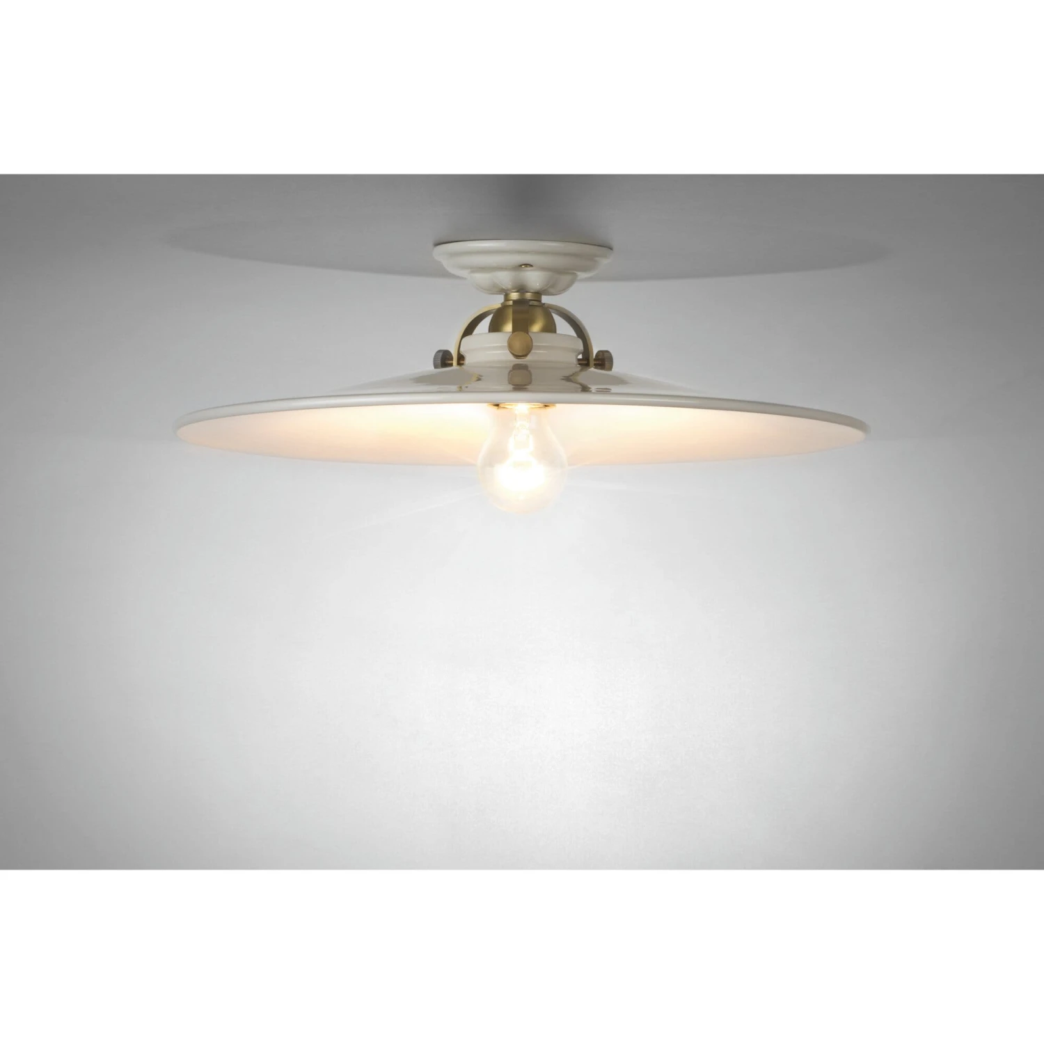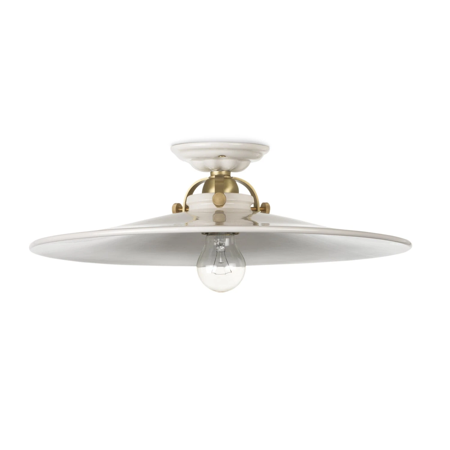 Natuurlijke witte kap van keramiek (Ø 42 cm), plafondrozet (Ø 11,5 cm) van keramiek, met een schaalhouder van massief messing. De kap wordt vastgehouden met drie kartelschroeven. Hoogte 10,5 cm. Metalen fitting E27 (max. 100 W). Gewicht 1,9 kg. Gemaakt in Italië. Geleverd zonder lamp.
