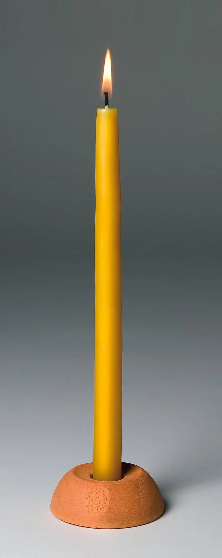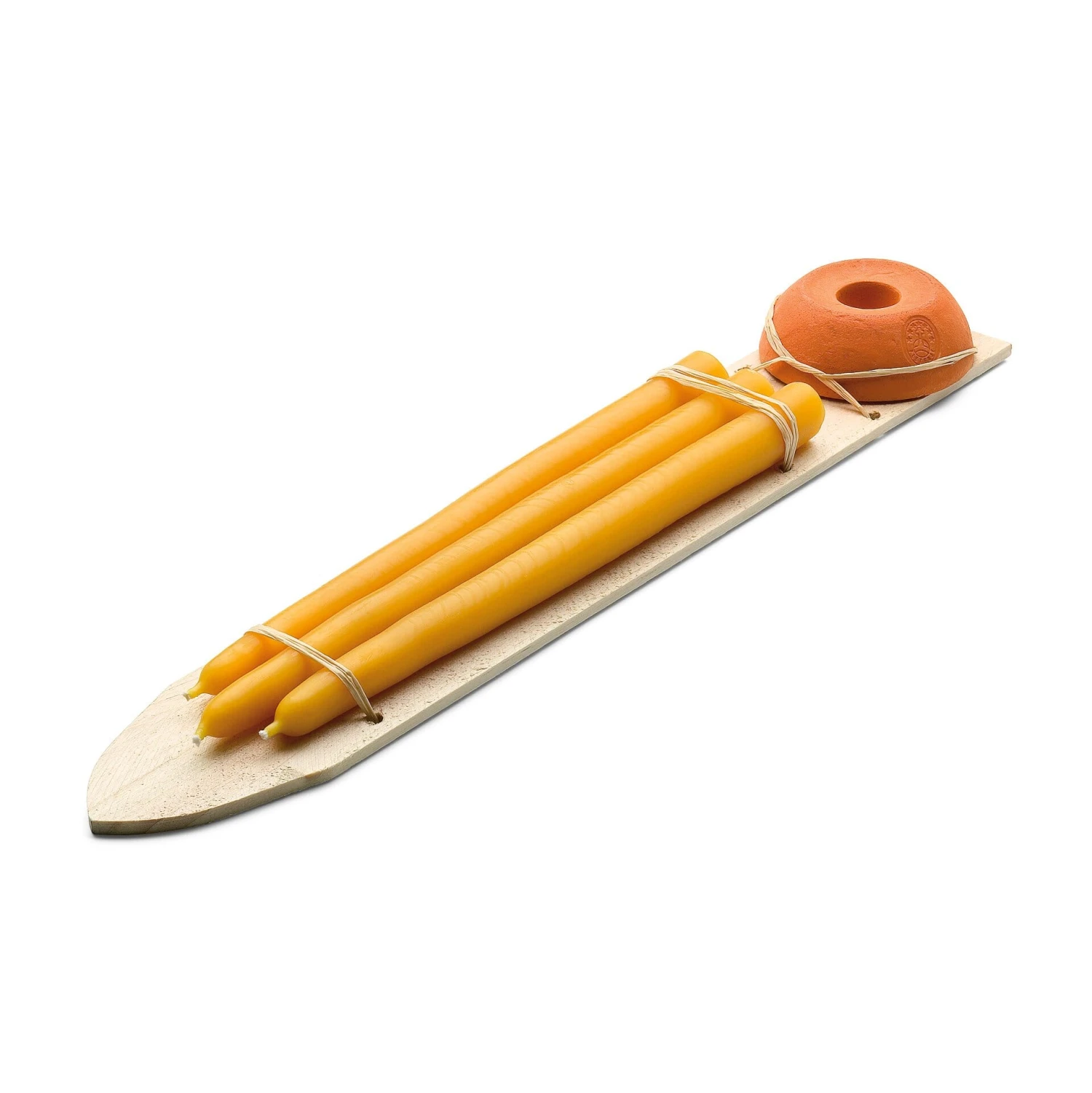 Deze prachtige kaarsenset, die als geschenk niet eens verpakt hoeft te worden, is gemaakt door de Sloveense Kartäuser in het Pleterje-klooster. De kaarsen worden met de hand gemaakt van hun eigen was. Ze zijn gemonteerd op een houten plankje, waarop ook een handgemaakte kandelaar van klei staat.