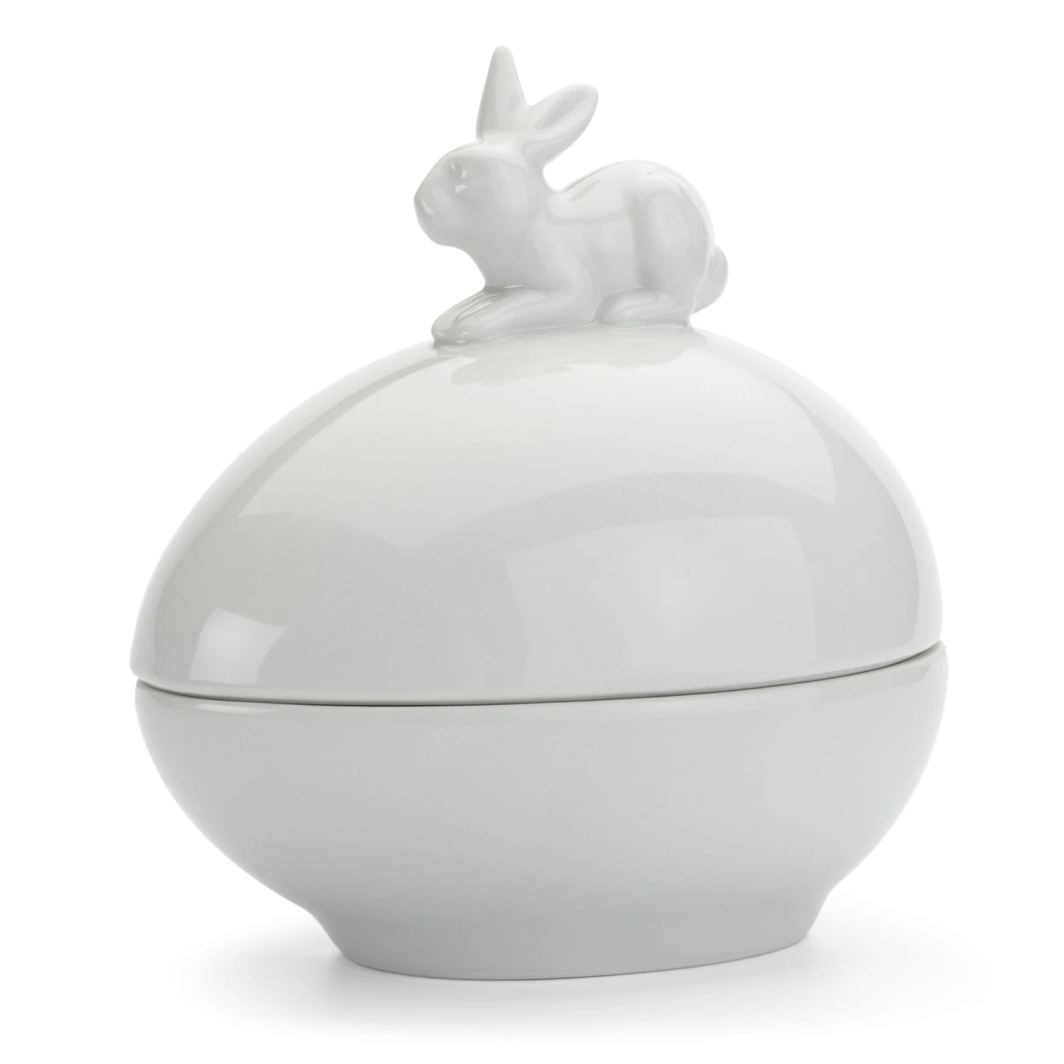 Lindner maakt deze eivormige bonbonnière van wit porselein. Het ziet er net zo decoratief uit als standaard naast het paasboeket als als geschenkverpakking voor lieve paasgroeten. Het deksel van de bonbonnière kan veilig worden vastgepakt en verwijderd van het zittende konijntje – en dankzij de robuustheid van het porselein hoef je niet eens aan de oren van Master Lamp te trekken.