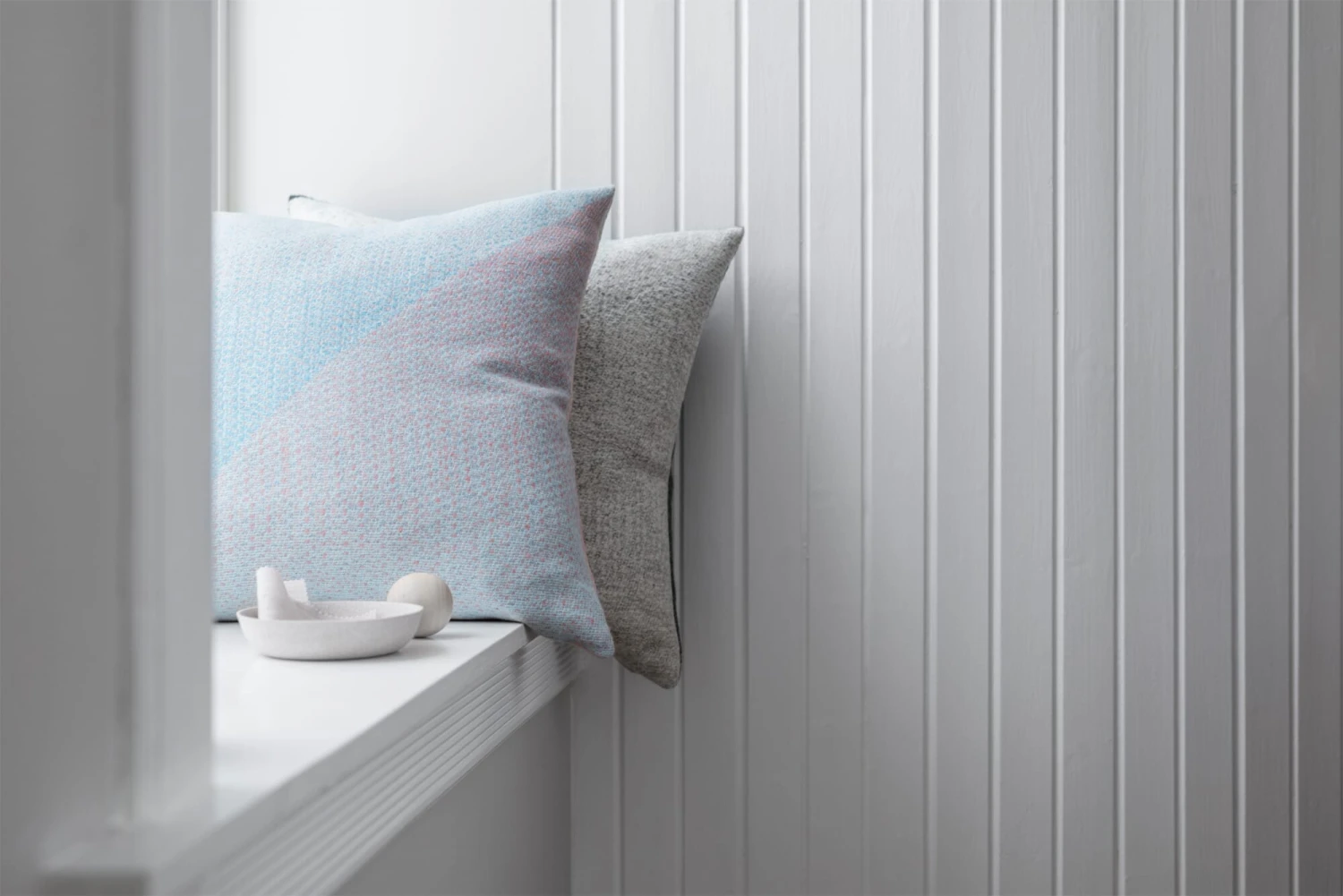Uit Noorwegen: Kussen in vierkant formaat met verfijnd kleurverloop geweven op traditionele wijze. Zonder vulling.