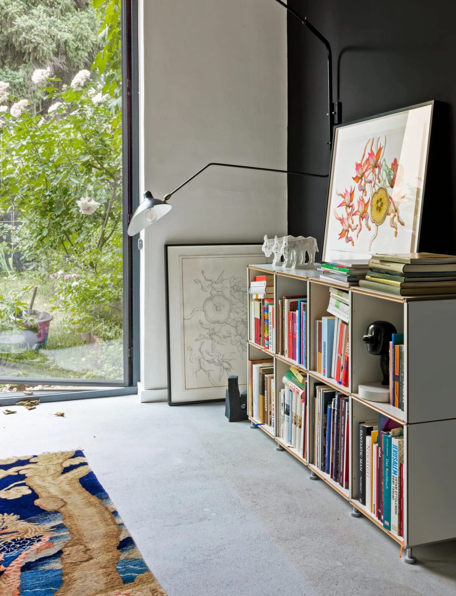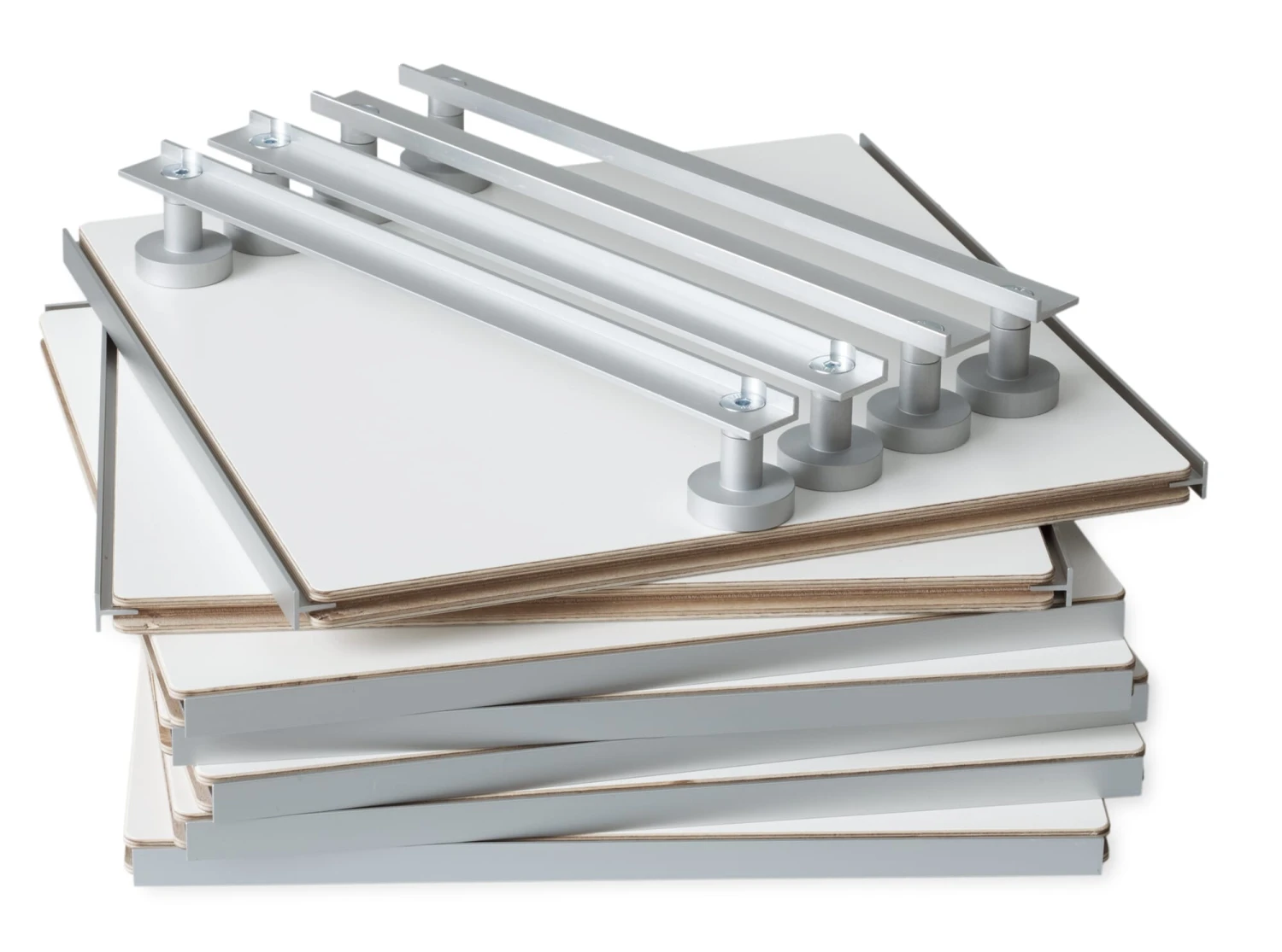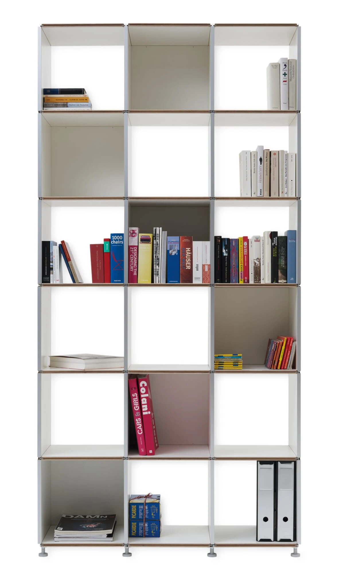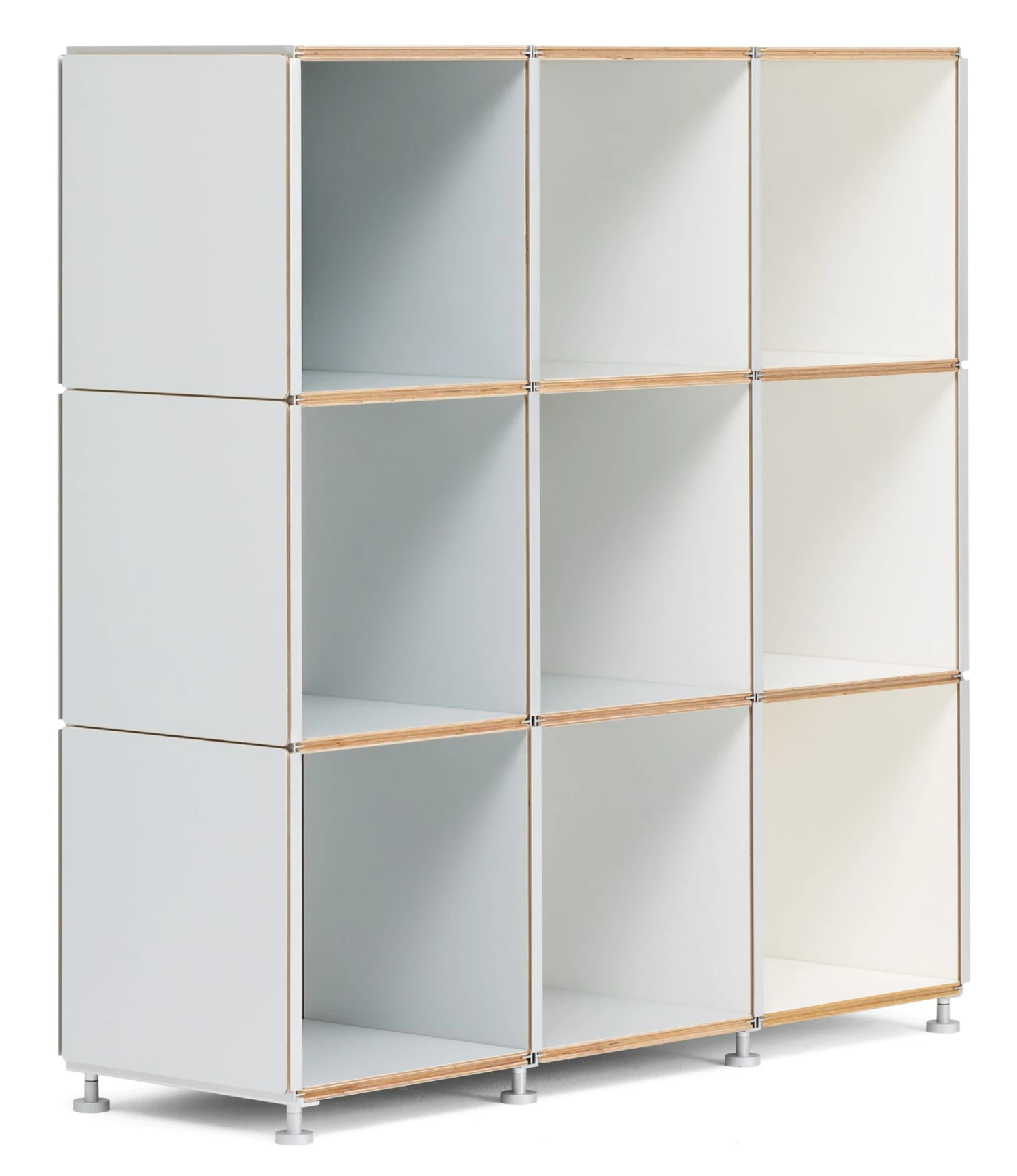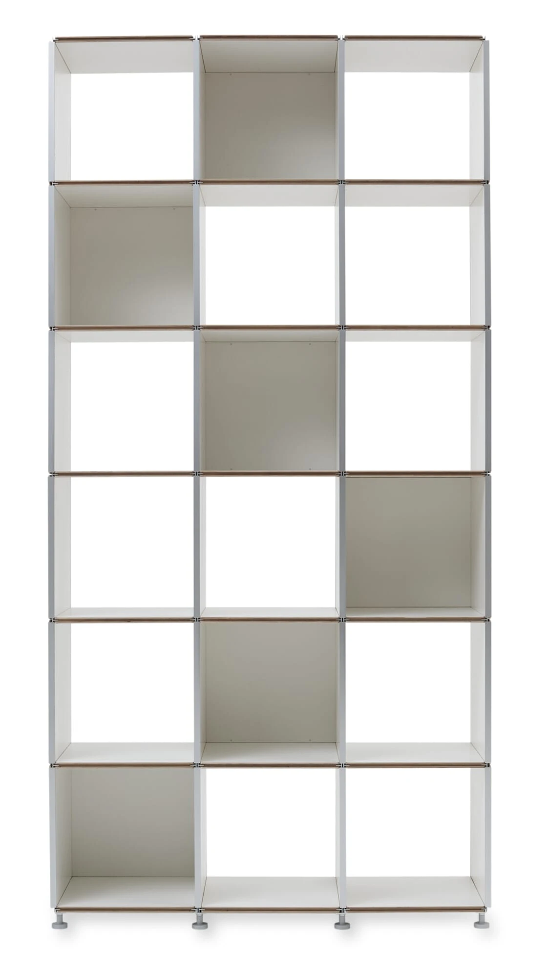 Eén component, onbeperkte mogelijkheden! De basis van het gepatenteerde rekkensysteem 1HOCH3 zijn vierkante of rechthoekige paneelelementen die gelijkelijk en dus universeel kunnen worden gebruikt als legborden, zijpanelen, bovenpanelen of achterpanelen. Dit leidt tot vrijwel onbeperkte variaties in de configuratie van een plank. De panelen, gemaakt van hoogwaardig multiplex, hebben de beste kwaliteitskenmerken zoals een gesloten en gemakkelijk te reinigen oppervlak van melaminehars. Een stellingkast kan in enkele minuten zonder gereedschap of hulpstukken worden gemonteerd en naar behoefte worden uitgebreid. Bij de montage van de afzonderlijke panelen grijpt het aluminium T-profiel van het ene element in de groef van het andere. Voor de nodige stabiliteit wordt op elk horizontaal niveau ten minste één element als rugwand gebruikt. 1HOCH3 maakt een groot aantal varianten mogelijk: van eenrijige rekken tot tweerijige ruimteverdelers en meerrijige verspringende indelingen met vrij te kiezen hoogten en breedten en een variabele vormgeving van de rugwand. Wij bevelen de bijbehorende voet van het systeem aan, die, fijn instelbaar, een optimale uitlijning van een plank mogelijk maakt.