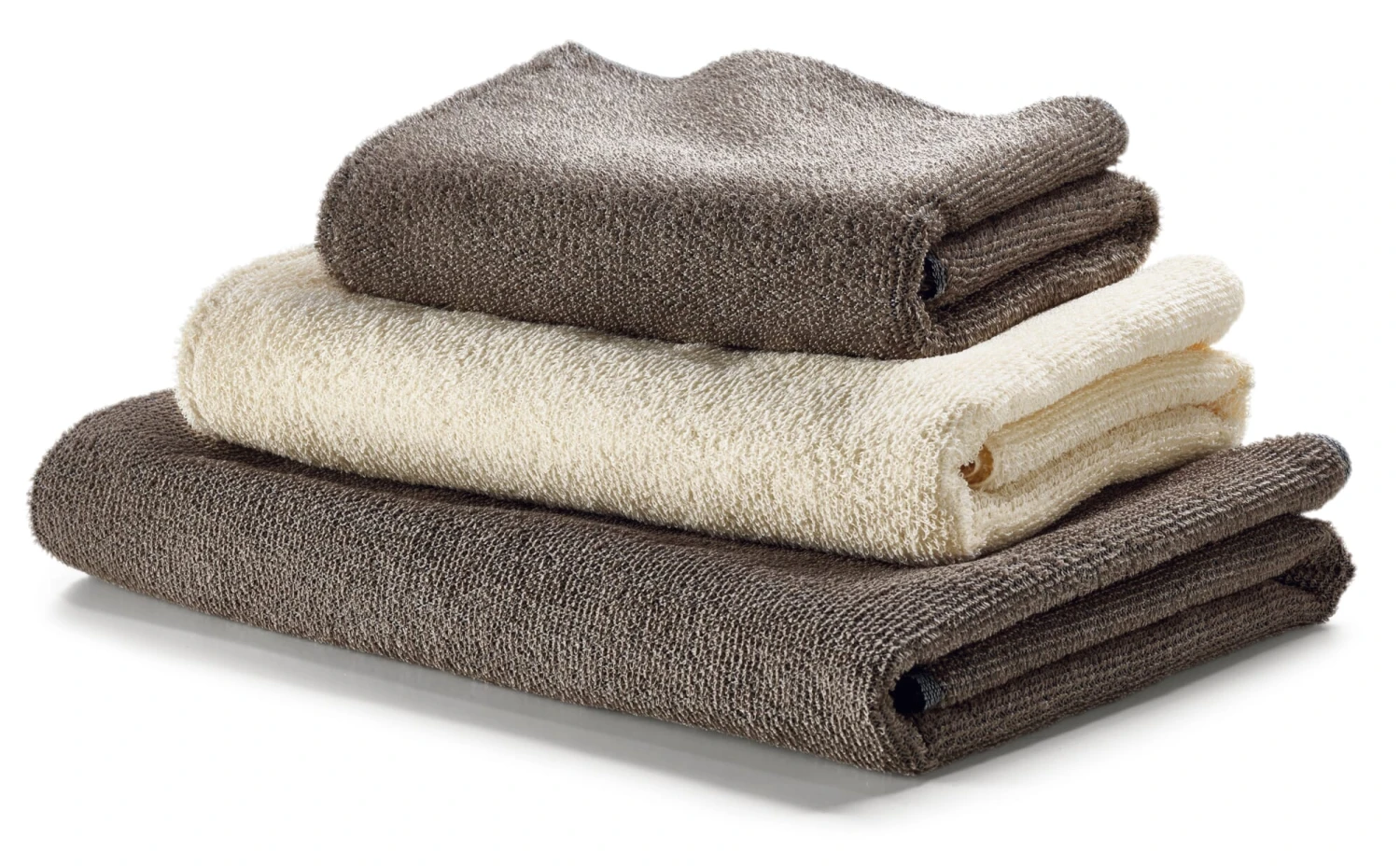 Echte badstof is een driedraads lusbinding (gemaakt van ketting, inslag en lus), die veel volumineuzer en absorberender is dan de enige badstofachtige tweedraads (alleen ketting en inslag) badstof vanwege de derde (lus)draad. Omdat er verschil van mening bestaat over handdoeken en wij zowel degenen die van de zachte handdoek houden als degenen die van ruigere goederen houden tegemoet willen komen, bieden wij badstof handdoeken in verschillende kwaliteiten aan: Naast twee katoenen badstof handdoeken, waarvan de ene bijzonder zacht en donzig is en de andere – in de geest van het beste hotellinnen – volumineus en toch korrelig aanvoelt, presenteren wij een slijtvaste linnen-katoen kwaliteit die je vandaag de dag zelden vindt.