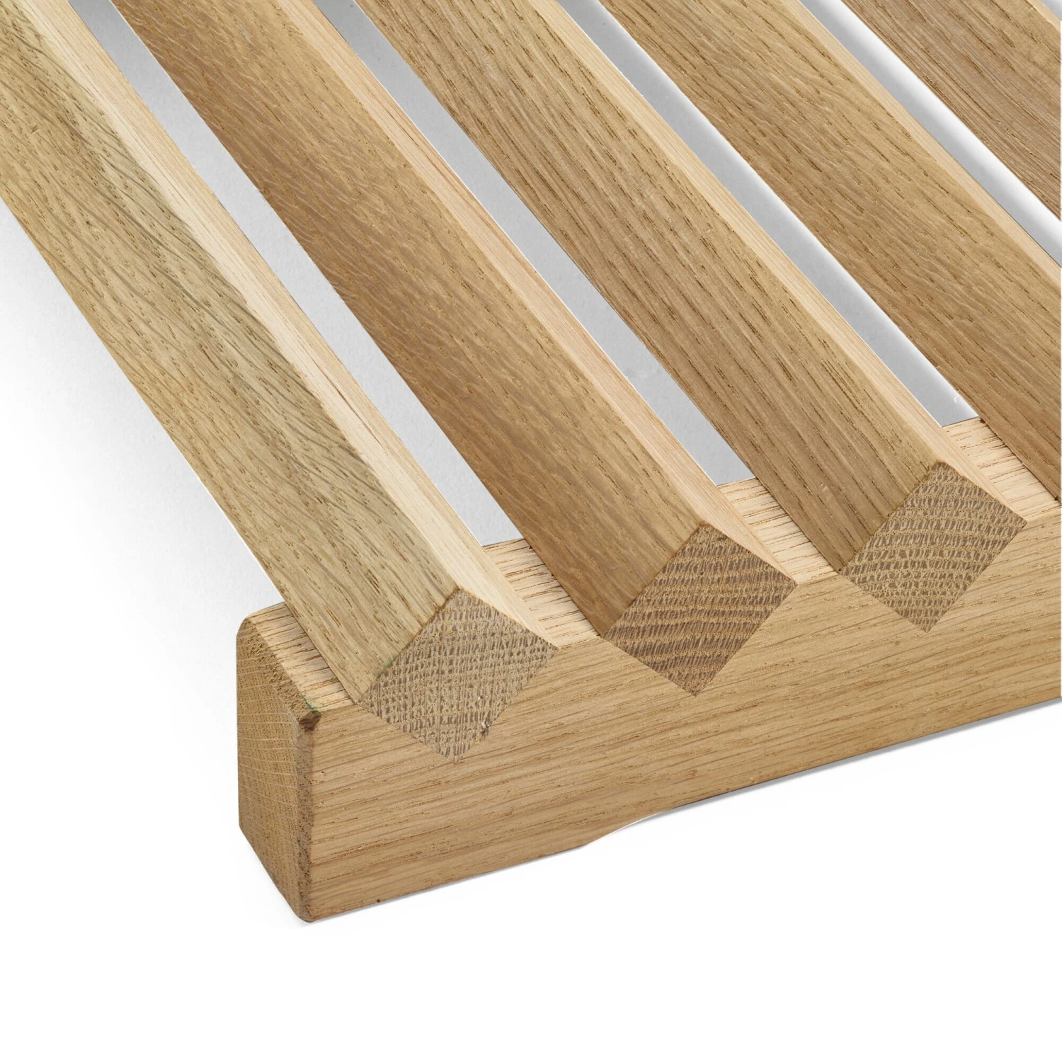De loopvlakken van dit stevige schoenenrek hebben scherpe randen, zodat eventuele grond, stenen, modder of sneeuw die aan de zolen blijft kleven erin vast komt te zitten. Omdat het waterdicht is gelijmd en bovendien met roestvrijstalen schroeven is vastgeschroefd, is de houten constructie van massief, vochtbestendig eikenhout duurzaam. Het onbehandelde materiaal zal echter in de loop der jaren grijs worden.