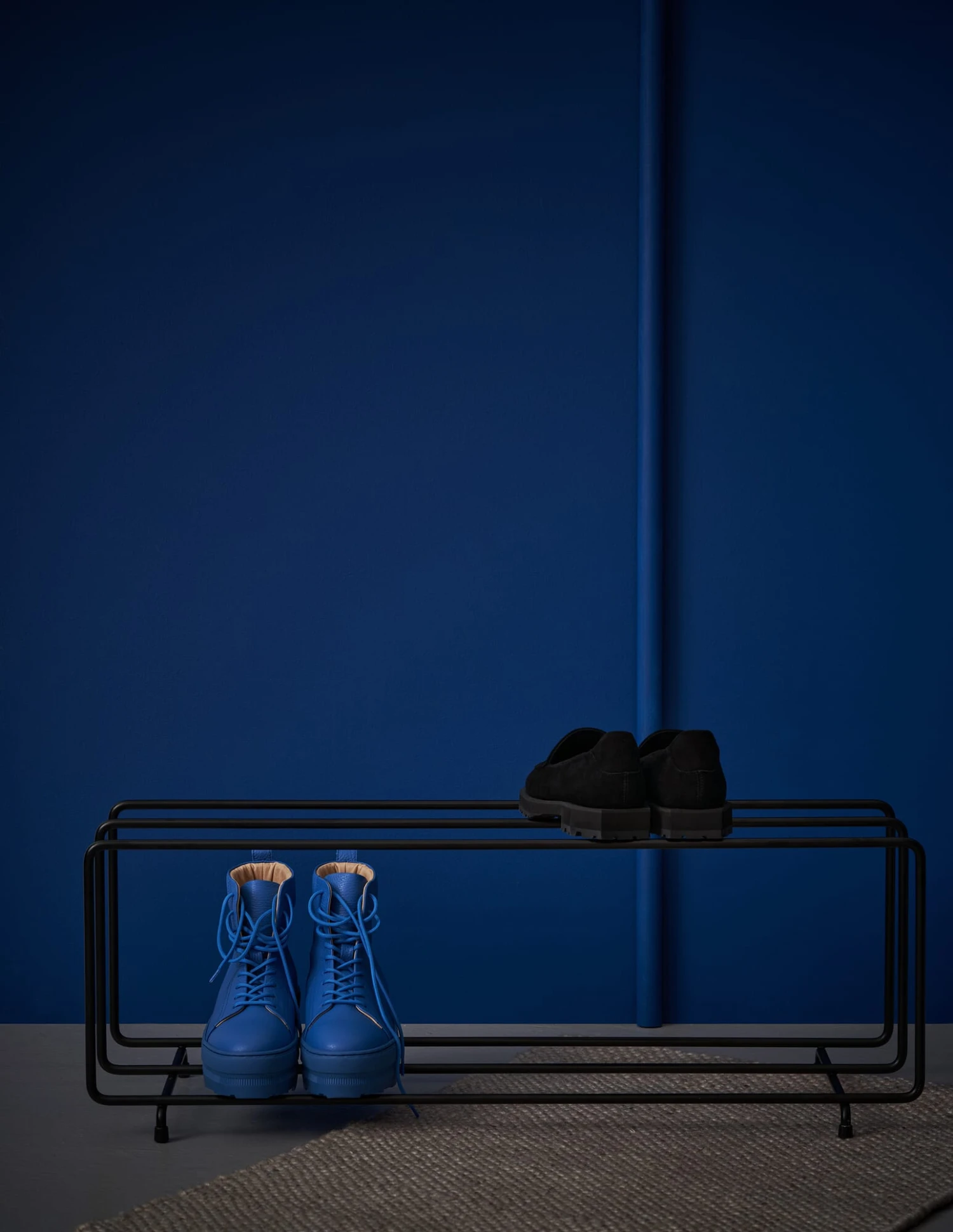 Fraai schoenenrek van stalen staven met slijtvast, gepoedercoat oppervlak. Voor plaatsing op de vloer of, met behulp van de apart verkrijgbare wandbevestiging, ook voor montage aan de muur.