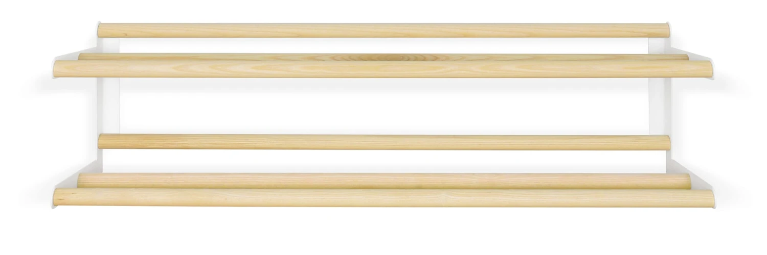 Het STIXX schoenenrek voor wandmontage. Gemaakt van essenhouten staven en verbindingselementen van plaatstaal, draagt het rek, dat gedemonteerd wordt geleverd en met weinig moeite kan worden gemonteerd, tot vier paar dames- en herenschoenen per paar staven. De accessoires voor wandmontage zijn bij de levering inbegrepen.