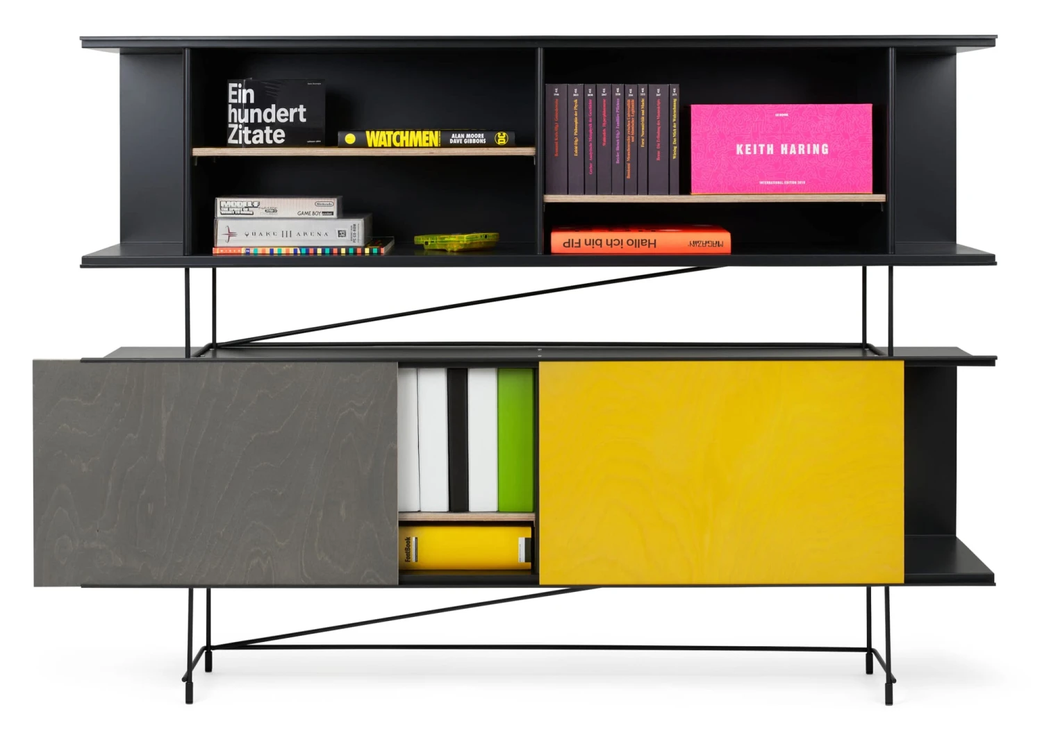 Karkas: Het karkas is het hart van FIP. Hij kan met behulp van de wandrail aan de muur worden bevestigd als legplank of met de sokkel worden gecombineerd tot een dressoir. Sokkel: De sokkel wordt onder de romp geplaatst en maakt van de FIP een dressoir. Met zijn steekverbindingen kan hij echter ook tussen twee rompelementen worden geplaatst. Het dressoir wordt dan een highboard. Wandrail: Met de wandrail kan de romp aan de muur worden bevestigd. Hij kan worden gebruikt als open boekenkast of als gesloten wandmeubel, voorzien van een legplank en/of schuifdeur. Schuifdeur: De schuifdeur maakt van de open kast een gesloten opbergmeubel. Een romp kan één of twee schuifdeuren bevatten. Plank: De planken zorgen voor extra afscheiding in de romp. De vrije hoogte is 33 cm. Met de legplanken kan deze hoogte worden verdeeld in vakhoogten van 8,5 cm, 16 cm of 23,5 cm. Een romp kan tot zes planken bevatten.