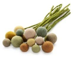 Bloem 100% scheerwol (herkomst Nieuw-Zeeland). Stengels draad, omwikkeld met scheerwol. Set met in totaal 14 vilten bloemen: 7 grotere en 7 kleinere. Bloem Ø 2-4 cm elk. Totale lengte van elke bloem ca. 31 cm. Totaal gewicht 100 g. Levering zonder vaas en decoratie.