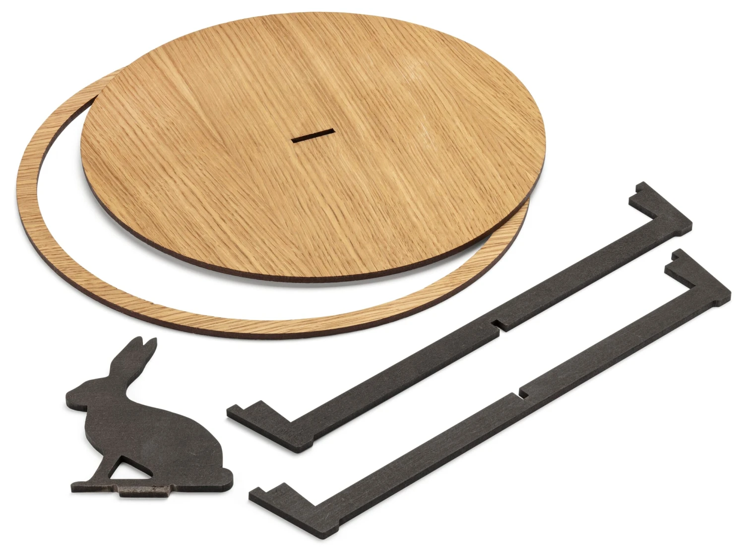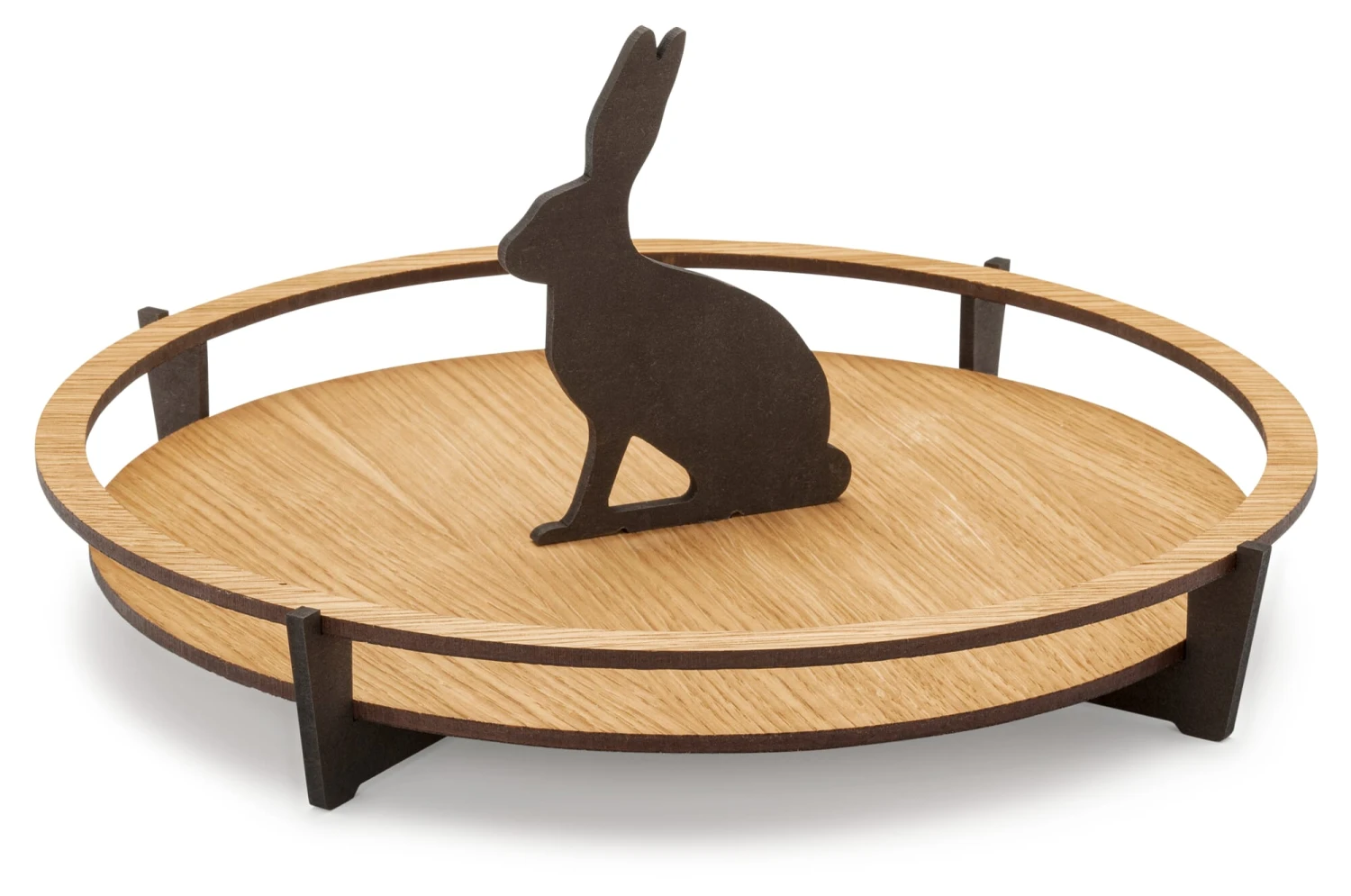 De afzonderlijke elementen van de schaal – bodemplaat en randring (beide gefineerd in eikenhout), alsook het frame en het konijntje – zijn eenvoudig in elkaar gezet door lasersnijden uit de massieve MDF-plaat. Met het konijntje heb je de klassieke constellatie van een paasnest, zonder het konijntje bereidt de schaal de grond voor op je decoratieve wensen gedurende het hele jaar. Als u intussen de drang voelt om grenzeloos te zijn, kunt u ook de randring verwijderen en alleen het frame en de bodemplaat gebruiken voor uitbundige ontwerpideeën.