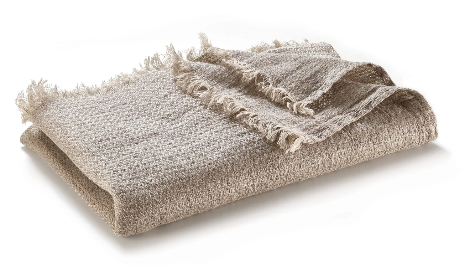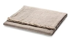 100% linnen. Herkomst Litouwen. Structureel weefsel. Basisgewicht 200 g/m². Natuurlijke kleur. Gemaakt in Litouwen. 140 × 240 cm incl. de franjes van 3 cm. Gewicht 690 g.