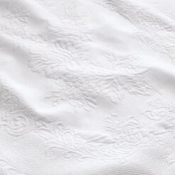 Zuiver wit en met jacquardmotieven, spreien en bedspreien van matelassé zijn klassiekers in het Middellandse-Zeegebied – in Italië en Spanje, maar ook in Portugal, waar ze gespecialiseerd zijn in de productie van de stof. Als dubbel weefsel lijkt matelassé altijd licht gestoffeerd. Voor de productie ervan worden twee schering- en twee inslagsystemen gebruikt. Het garengetal van het bovenste weefsel bedraagt Nm 68/2 in de ketting en Nm 17 in de inslag; het garengetal van het onderste weefsel bedraagt eveneens Nm 68/2 in de ketting en Nm 10/2 in de inslag. Het bloemenpatroon komt levendig naar voren aan de bovenkant, ondersteund door een grove onderlaag. De sprei en bijpassende kussenhoezen zijn gemaakt door een weverij in het noorden van Portugal die gespecialiseerd is in matelassé.