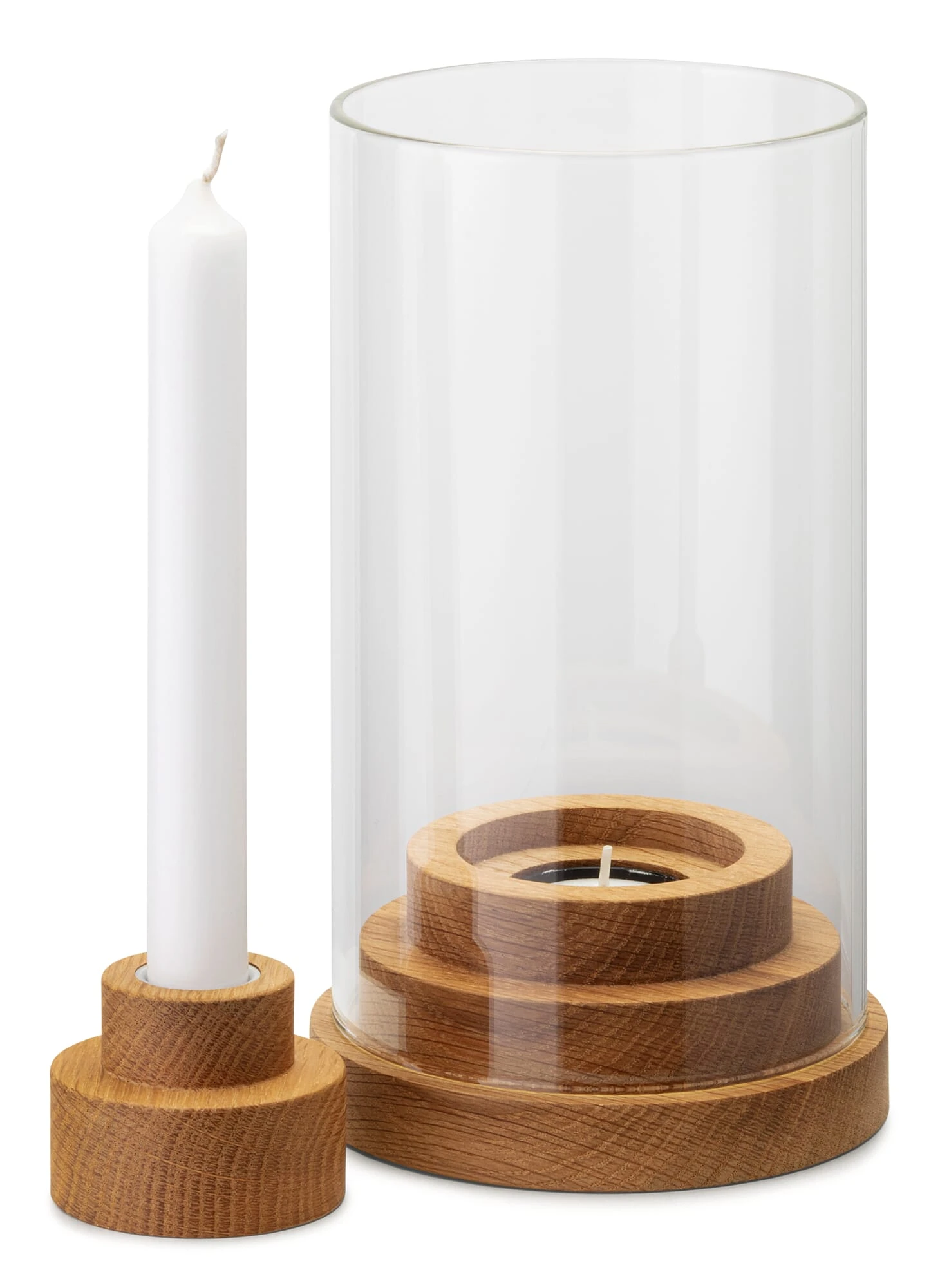 Geoliede eik (herkomst Duitsland). Glazen cilinder. Ø 12,5 cm, hoogte 23 cm. Gewicht 880 g. Een theelichtje en een kaars zijn inbegrepen.