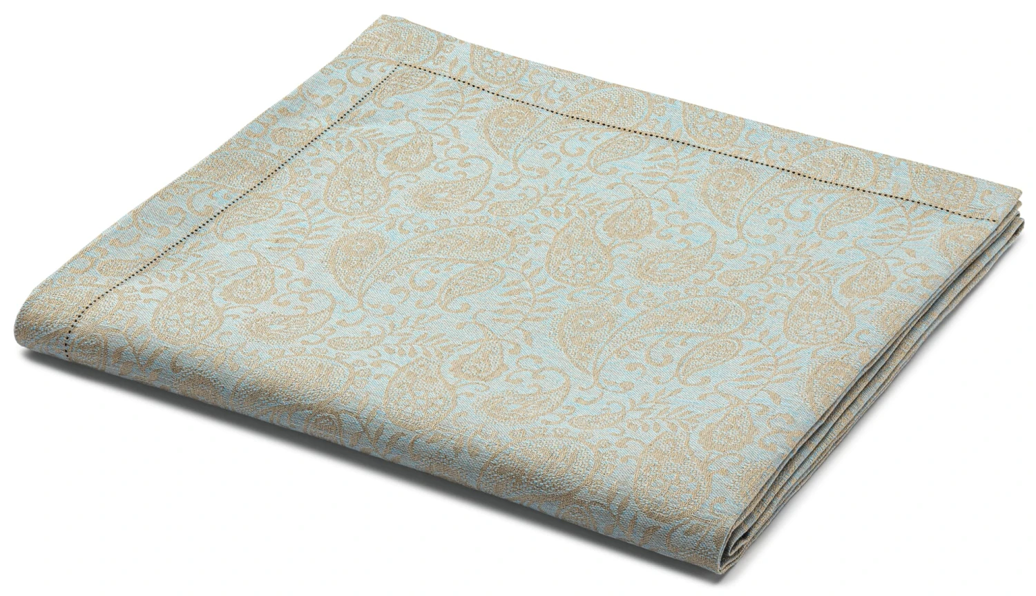 Het delicate paisleypatroon van dit linnen tafelkleed is gemaakt op jacquardweefgetouwen. Het linnen is gemaakt van garen van het beste Europese langvezelige vlas, waardoor het jacquardweefsel een mooie, subtiel glanzende glans heeft – de glans die typisch is voor linnen. Door het gebruik van ongeverfd linnen in de ketting en geverfd linnen garen in de inslag ontstaat een blauwe achtergrond waartegen de naturelkleurige paisley prachtig afsteekt. Het naturel gekleurde patroon gebruikt het ongeverfde garen in de inslag. Met een handgemaakte zoom rondom geeft het tafelkleed feestelijke glamour aan uw tafel, maar het is ook geschikt voor (dagelijks) gebruik, want linnen is vuilafstotend, gemakkelijk schoon te maken, uiterst duurzaam en gaat dus lang mee. Alleen bij het strijken moet u ervoor zorgen dat het linnengoed nog vochtig is – dit beschermt de stof en maakt het gemakkelijker hanteerbaar.