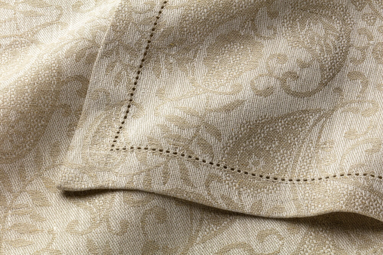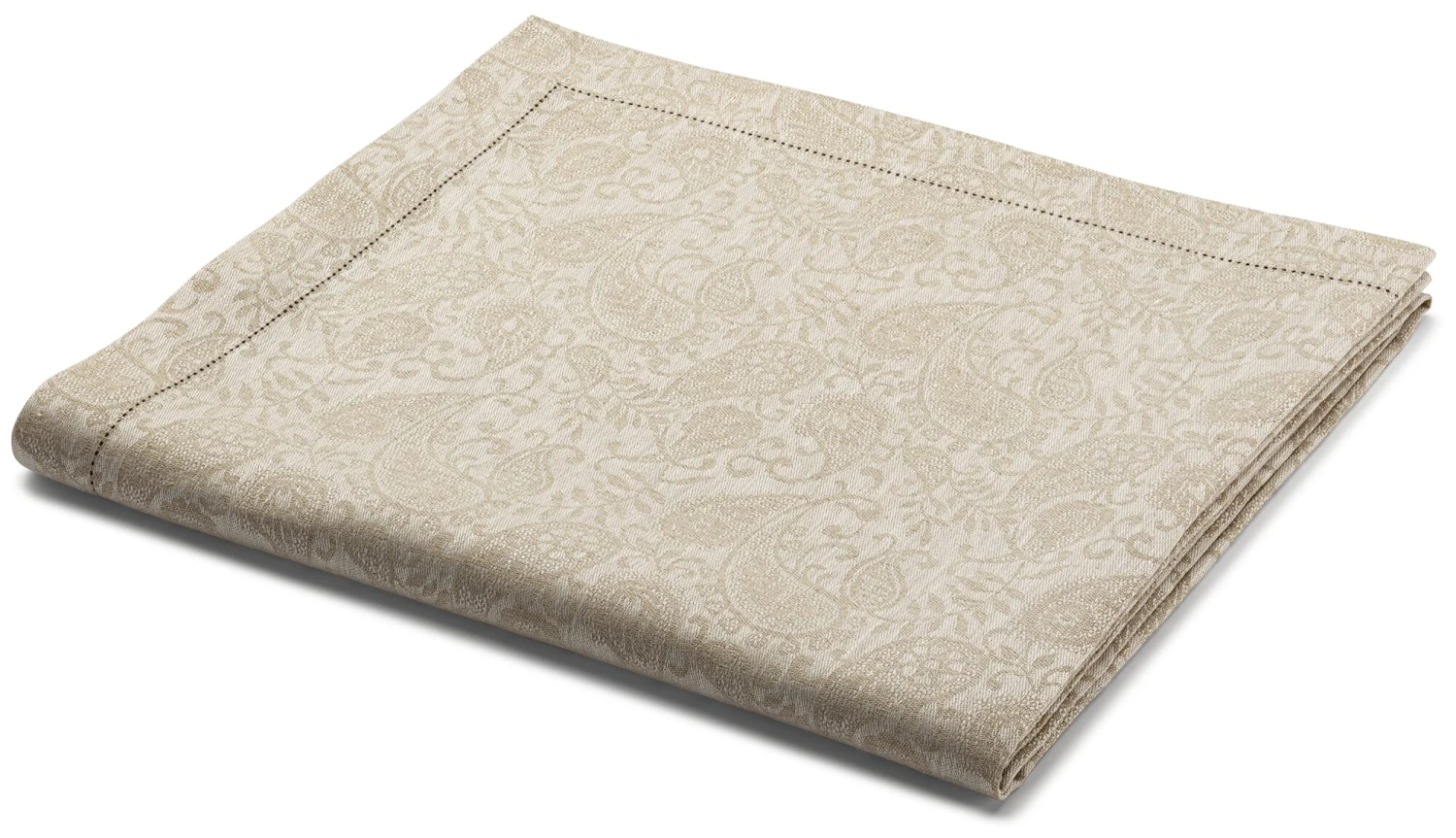 Het delicate paisleypatroon van dit linnen tafelkleed is gemaakt op jacquardweefgetouwen. Het linnen is gemaakt van garen van het beste Europese langvezelige vlas, waardoor het jacquardweefsel een mooie, subtiel glanzende glans heeft – de glans die typisch is voor linnen. Door het gebruik van ongeverfd linnen in de ketting en geverfd linnen garen in de inslag ontstaat een blauwe achtergrond waartegen de naturelkleurige paisley prachtig afsteekt. Het naturel gekleurde patroon gebruikt het ongeverfde garen in de inslag. Met een handgemaakte zoom rondom geeft het tafelkleed feestelijke glamour aan uw tafel, maar het is ook geschikt voor (dagelijks) gebruik, want linnen is vuilafstotend, gemakkelijk schoon te maken, uiterst duurzaam en gaat dus lang mee. Alleen bij het strijken moet u ervoor zorgen dat het linnengoed nog vochtig is – dit beschermt de stof en maakt het gemakkelijker hanteerbaar.