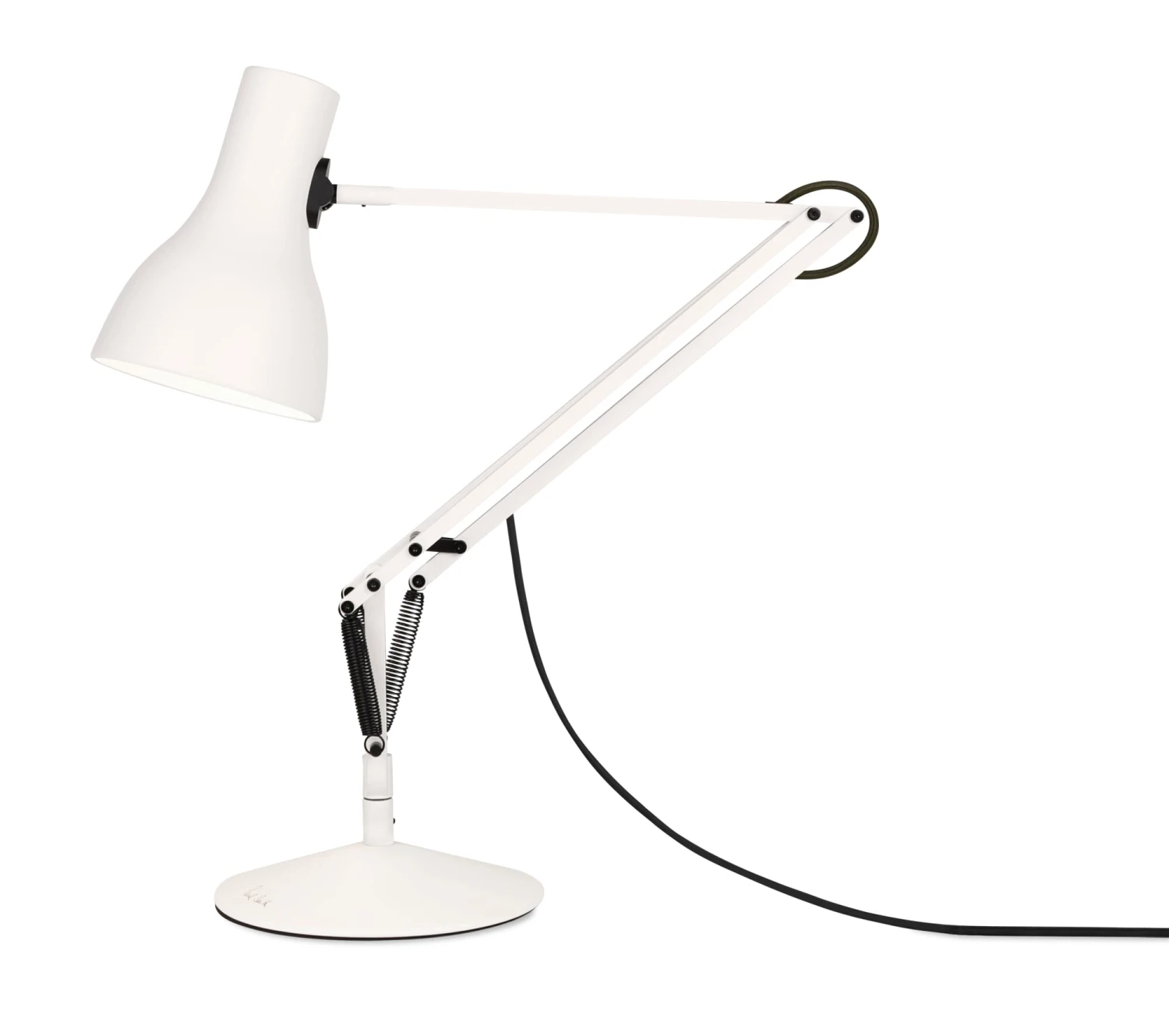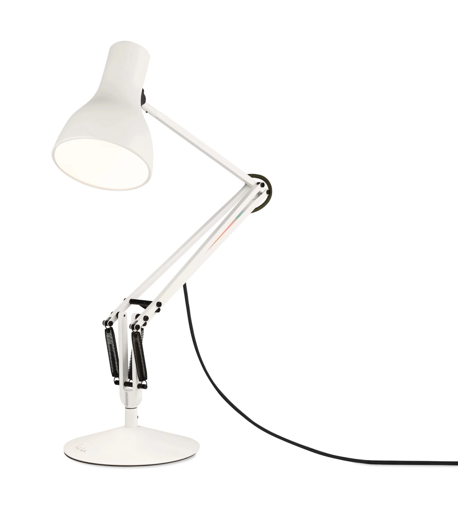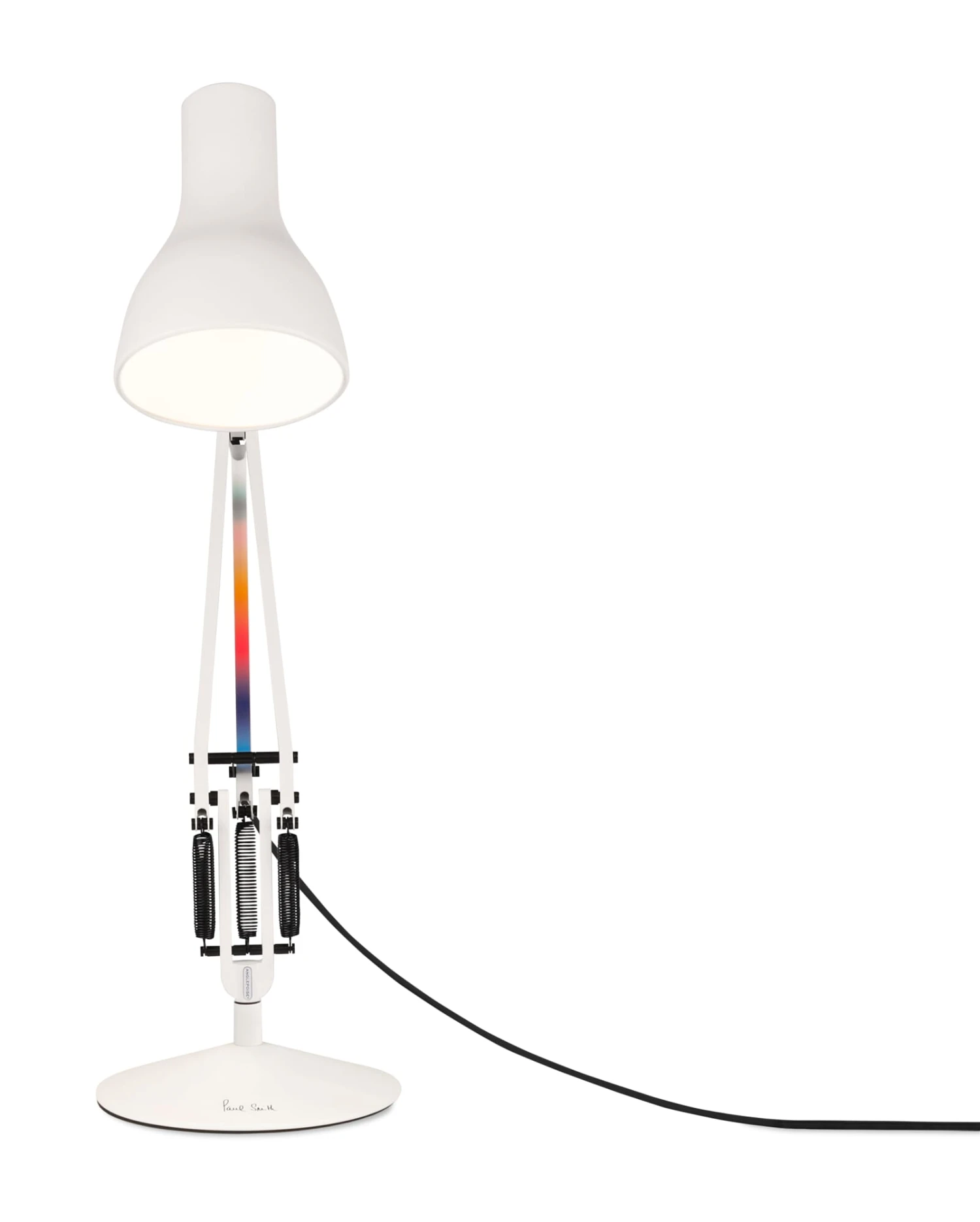In een laatste Paul Smith editie wordt de ANGLEPOISE® tafellamp gepresenteerd in mat wit met zwart-nikkel fittingen en een verfijnd kleurenspel op de centrale scharnierarm, typisch voor Sir Paul. De oervoorloper van deze werklamp werd ontworpen op basis van de uitvinding van een nieuw type trekveer. De ANGLEPOISE® TYPE 75 vertegenwoordigt de laatste fase in de ontwikkeling van dit type lamp. De structuur en de kap zijn van aluminium. De armatuur is stabiel, ongecompliceerd uit te lijnen en de armatuurkop heeft ook een kogelgewricht. Kabel: L 270 cm, Eurostekker. Stopcontact: E27. Het armatuur wordt geleverd met een LED-lamp. Stroomverbruik: max. 20 W.