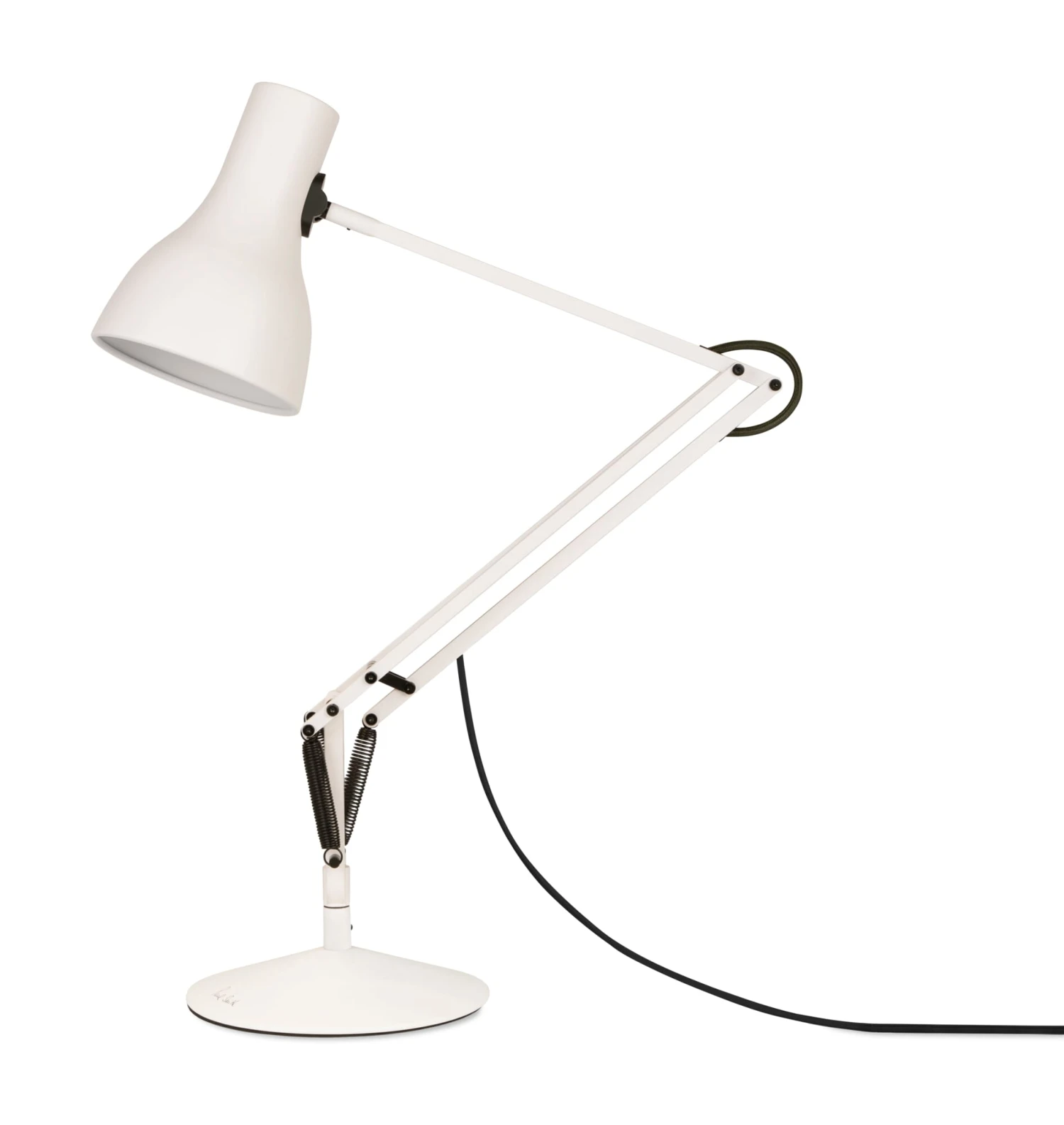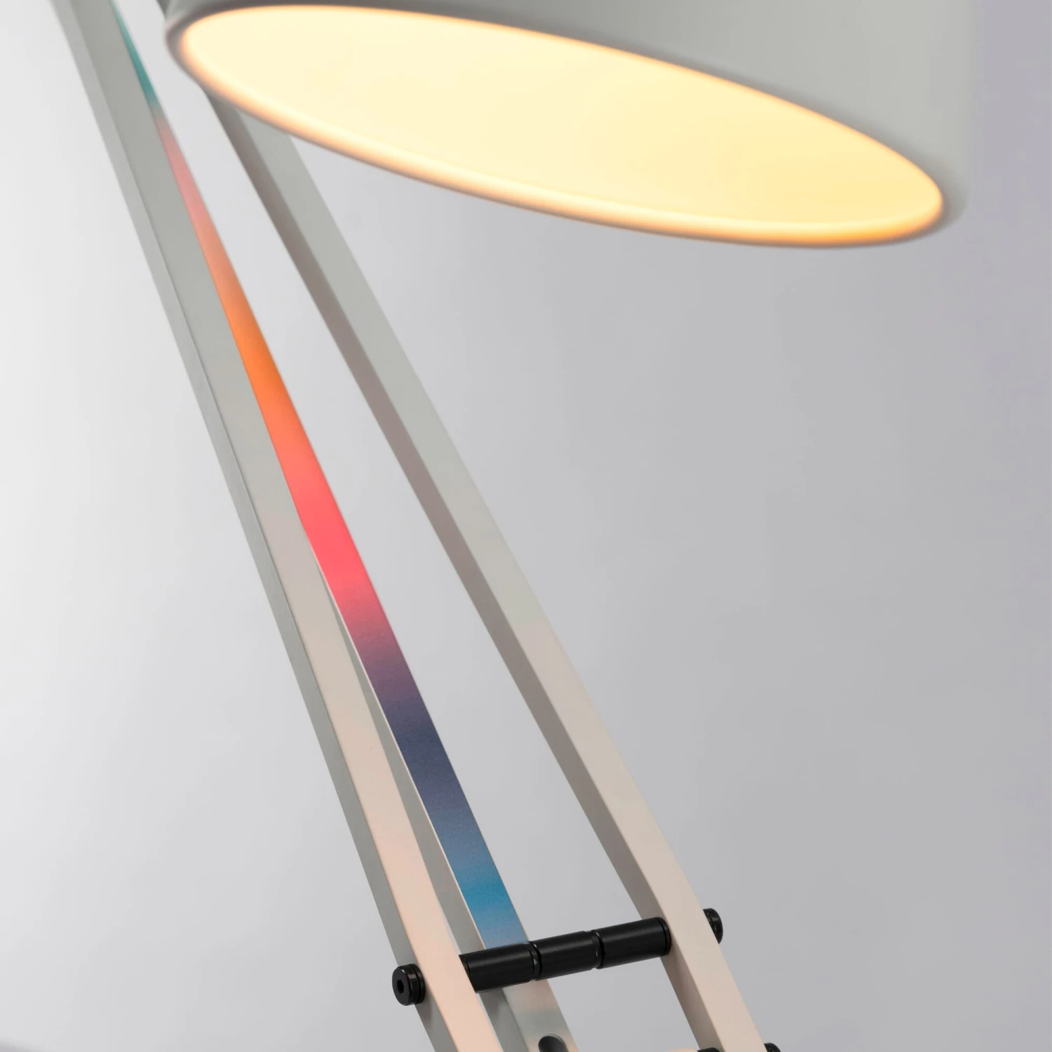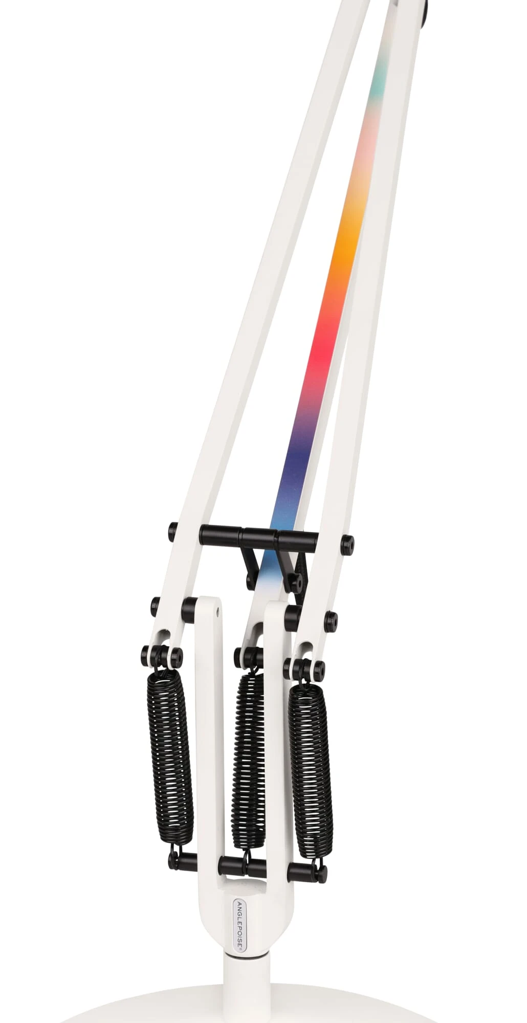 In een laatste Paul Smith editie wordt de ANGLEPOISE® tafellamp gepresenteerd in mat wit met zwart-nikkel fittingen en een verfijnd kleurenspel op de centrale scharnierarm, typisch voor Sir Paul. De oervoorloper van deze werklamp werd ontworpen op basis van de uitvinding van een nieuw type trekveer. De ANGLEPOISE® TYPE 75 vertegenwoordigt de laatste fase in de ontwikkeling van dit type lamp. De structuur en de kap zijn van aluminium. De armatuur is stabiel, ongecompliceerd uit te lijnen en de armatuurkop heeft ook een kogelgewricht. Kabel: L 270 cm, Eurostekker. Stopcontact: E27. Het armatuur wordt geleverd met een LED-lamp. Stroomverbruik: max. 20 W.