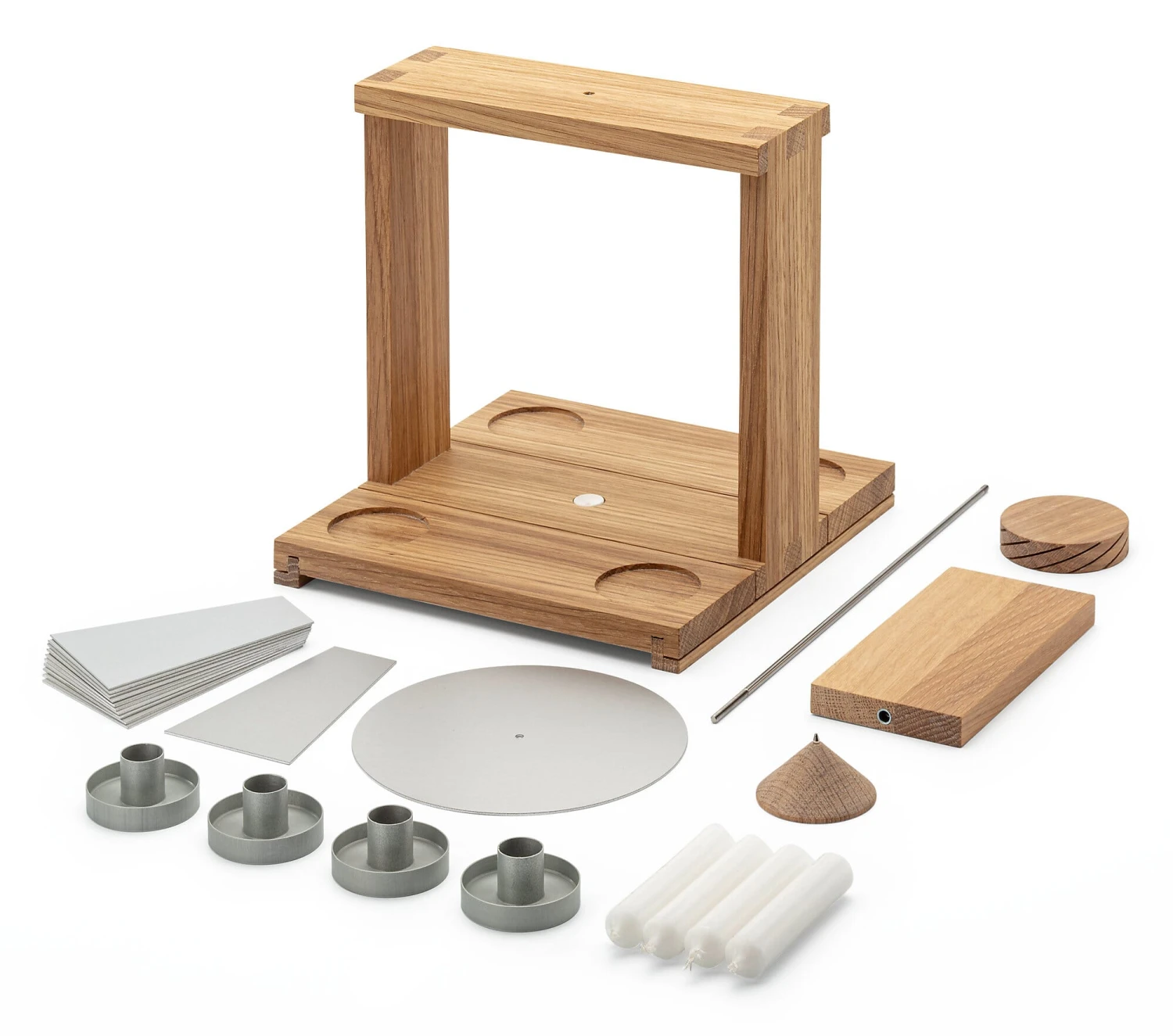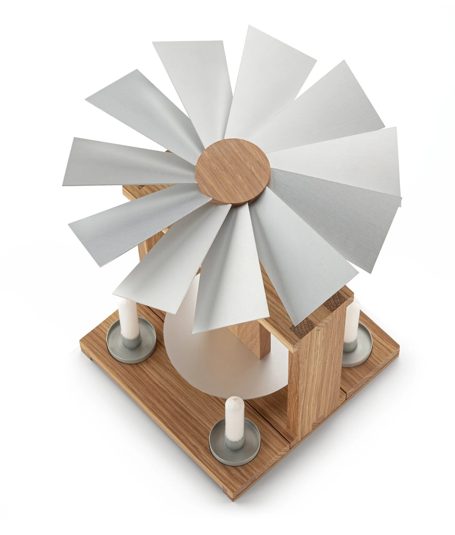 Köhler heeft in Jens Tuffner uit Langenweißbach (bij Chemnitz) een gelijkgestemde gevonden. Tuffners ontwerpen, die gebaseerd zijn op de meubelmakerij, spreken dezelfde minimalistische vormentaal en tonen hetzelfde respect voor het materiaal. Zijn tafelpiramide heeft precies wat een kerstpiramide nodig heeft, niet meer – en zeker niet minder, functioneel en geconstrueerd met bijna wiskundige precisie. Alle houten elementen zijn netjes in de beste timmermanskunst in elkaar gezet en gelijmd. De nerf blijft door de oppervlaktebehandeling behouden en onderstreept het markante karakter van het eikenhout, waaraan het aluminium een aantrekkelijk accent toevoegt. Last but not least zijn de steekverbindingen, bijvoorbeeld van de aluminium rotorbladen, zo nauwkeurig gemaakt dat niets wiebelt of wegglijdt. De bladen draaien schoon en stil en geven de kerstcijfers van Köhler weer een geweldige boost.