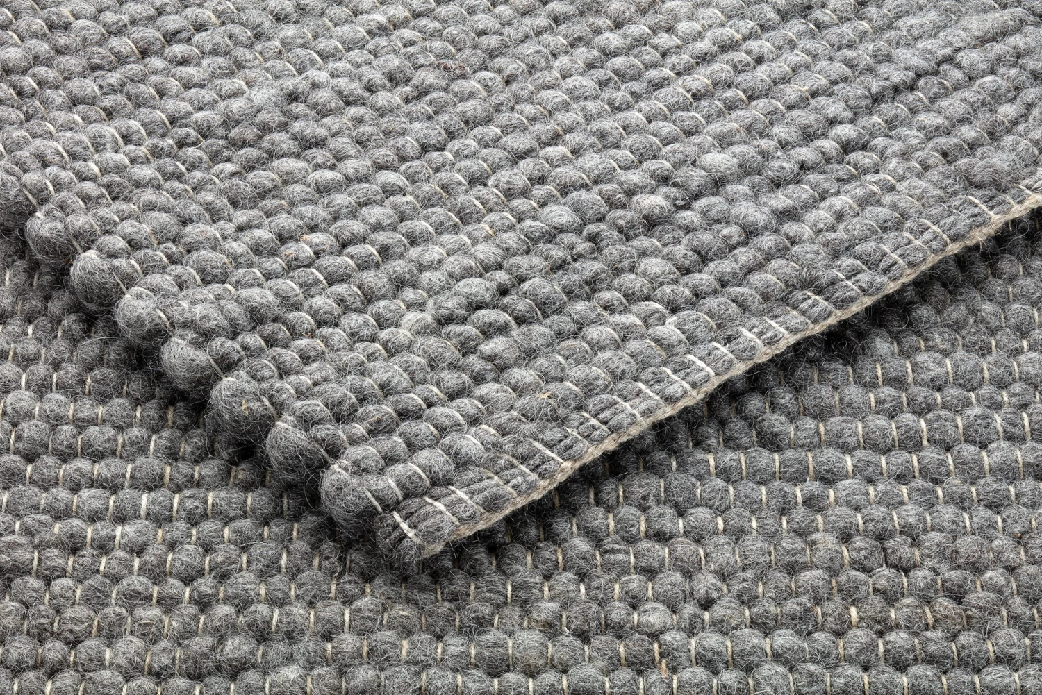 Het Gotland schaap (het hoornloze Zweedse pelsschaap) behoort tot de groep van de zogenaamde mengwol Noord-Europese kortstaartige schapen. Oorspronkelijk afkomstig uit Zweden, zijn er nu een paar kleine kweekkoppels in Duitsland. Gotland-schapen maken indruk met een langgroeiende, vrij dichte, fijn gekrulde wolvacht die in kleur varieert van zilver- en blauwgrijs tot bijna zwart – de lammeren worden geboren met een zwarte vacht, alleen de witte vezels die teruggroeien onthullen na verloop van tijd de grijze tinten. Zo temperamentvol, spaarzaam en robuust als de dieren zijn, zo slijtvast en sterk is hun wol. Voor onze geweven tapijten laten wij de wol verwerken in ongeverfde natuurtinten. 60% zuivere scheerwol van het Gotland schaap in de inslag, 30% linnen (onzichtbaar in de kern) en 10% zuivere scheerwol van de Heidschnucke. Ketting 100% linnen. Ongeverfd, grijs met gevlekte worpen.