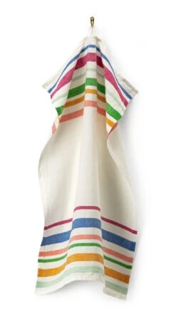 De shawl dankt zijn ontwerp en vrolijke kleuren aan deze Keniaanse invloed, want in de natuurlijke witte achtergrond zijn garengeverfde strepen van verschillende breedte geweven. Het linnen wordt geweven in een keperbinding en na de confectie ter plaatse gewassen, waardoor het een zachte greep en een levendige structuur krijgt – maar het kan niet perfect glad gestreken worden. Alleen de beste linnen garens van langvezelig vlas van Europese herkomst worden geweven op de weefgetouwen van het bedrijf, dat inmiddels aan zijn vierde generatie toe is. Bijpassend tafellinnen is ook verkrijgbaar, evenals een gedekte tafel.