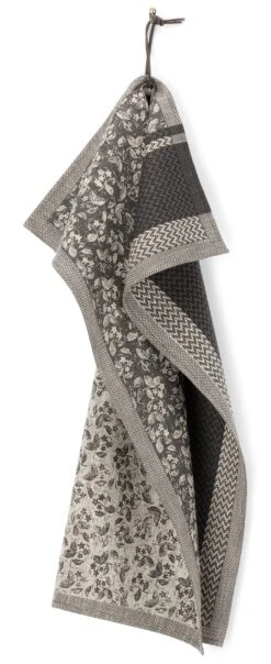 Absorberend en zacht zijn deze weelderige, met jacquard geweven theedoeken. Een linnengehalte van elf procent maakt ze nog sterker en slijtvaster. Met een gewicht per oppervlakte-eenheid van 300 g/m² zijn ze iets dikker dan gebruikelijk voor theedoeken en kunnen ze daarom worden gebruikt als keukenhanddoek of, indien dubbelgevouwen, als pannenlap. Niet alleen ongewoon, maar ook bijzonder praktisch is de leren band die met een oogje is bevestigd, waaraan de theedoek kan worden opgehangen. Het patroon, een combinatie van grote bloesems en medaillonstrepen of kleinere bloesems met zigzagstrepen, is uitgevoerd in antraciet- en lichtgrijze tinten, zodat het in elke keuken past. Omdat het jacquard geweven is, is het aan beide zijden op dezelfde manier te zien.