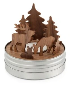 Kunstig vertalen de waxinelichthouders vakmanschap uit de geschiedenis in een eigentijds ontwerp. In een werkplaats in het Zwarte Woud wordt het notenhout op de millimeter nauwkeurig gesneden met een lasersnijder. De kerststal en de figuren in het bosmotief danken hun uiterst zuivere randen aan deze precisie. De groeven waarin de bosfiguren worden geplaatst, zijn even nauwkeurig in het walnoothout van de bodemplaat gefreesd – de rangschikking van de afzonderlijke figuren is variabel. Licht, schaduwen en de reflectie van het theelichtje dat in het midden van elke bodemplaat is geplaatst, brengen de taferelen sfeervol tot leven – een klein maar fijn theater dat in de metalen doos kan worden opgevouwen en overal kan worden meegenomen (en cadeau kan worden gedaan). Een klein boekje met het verhaal van elke scène is ook inbegrepen bij de theelichthouders.