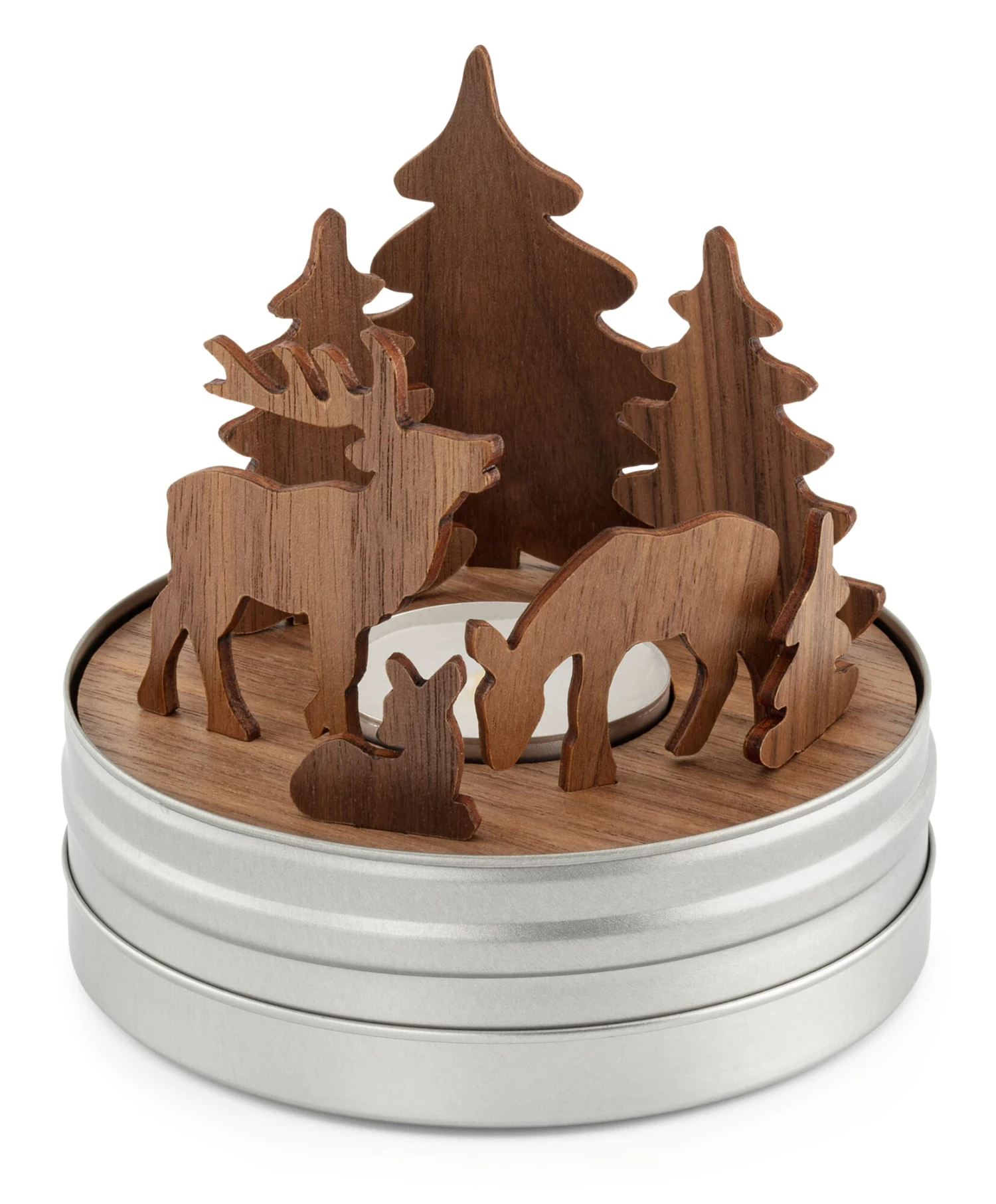 Theelichthouder Box story Nativity: Kerststal van walnoothout en waxinelichtje in een metalen doosje. Theelichthouder Box story Forest: Insteekonderdelen, figuren van walnoothout en waxinelichtje in een metalen doosje.