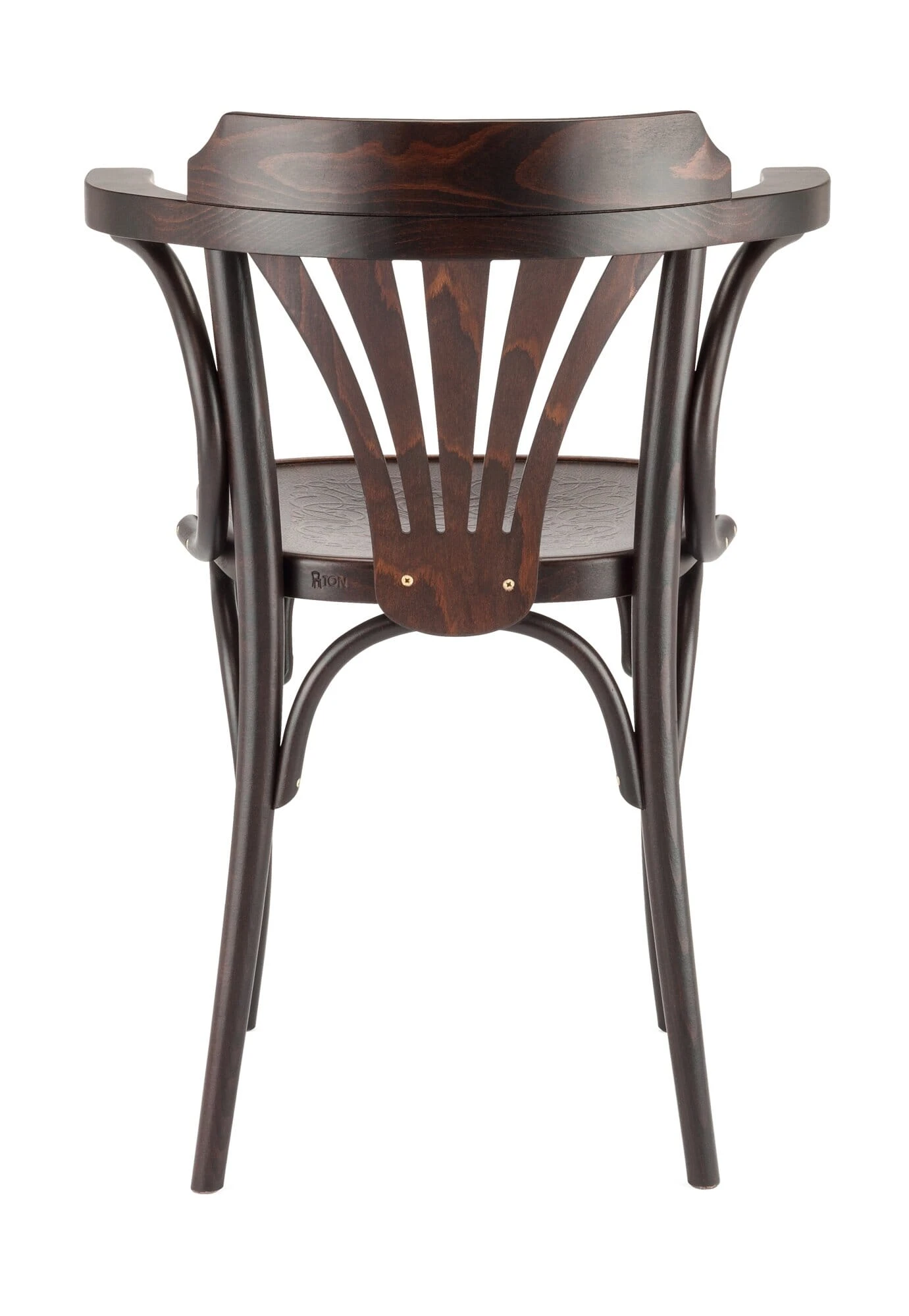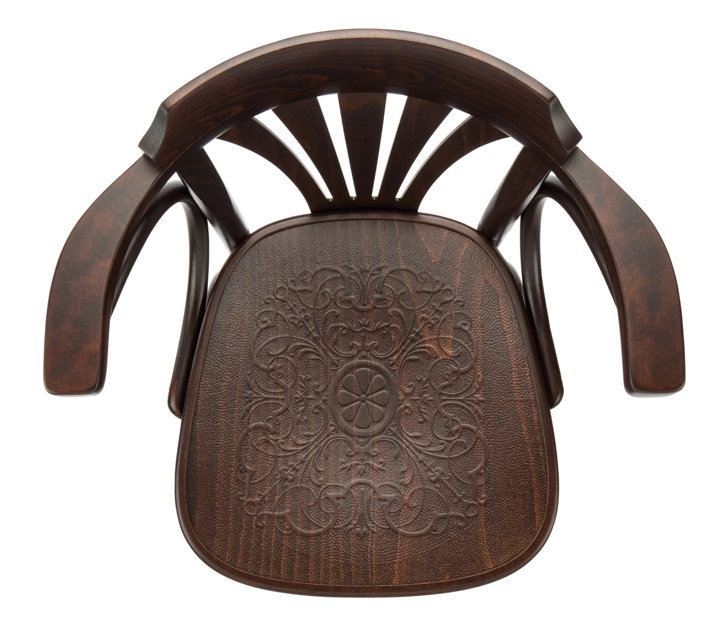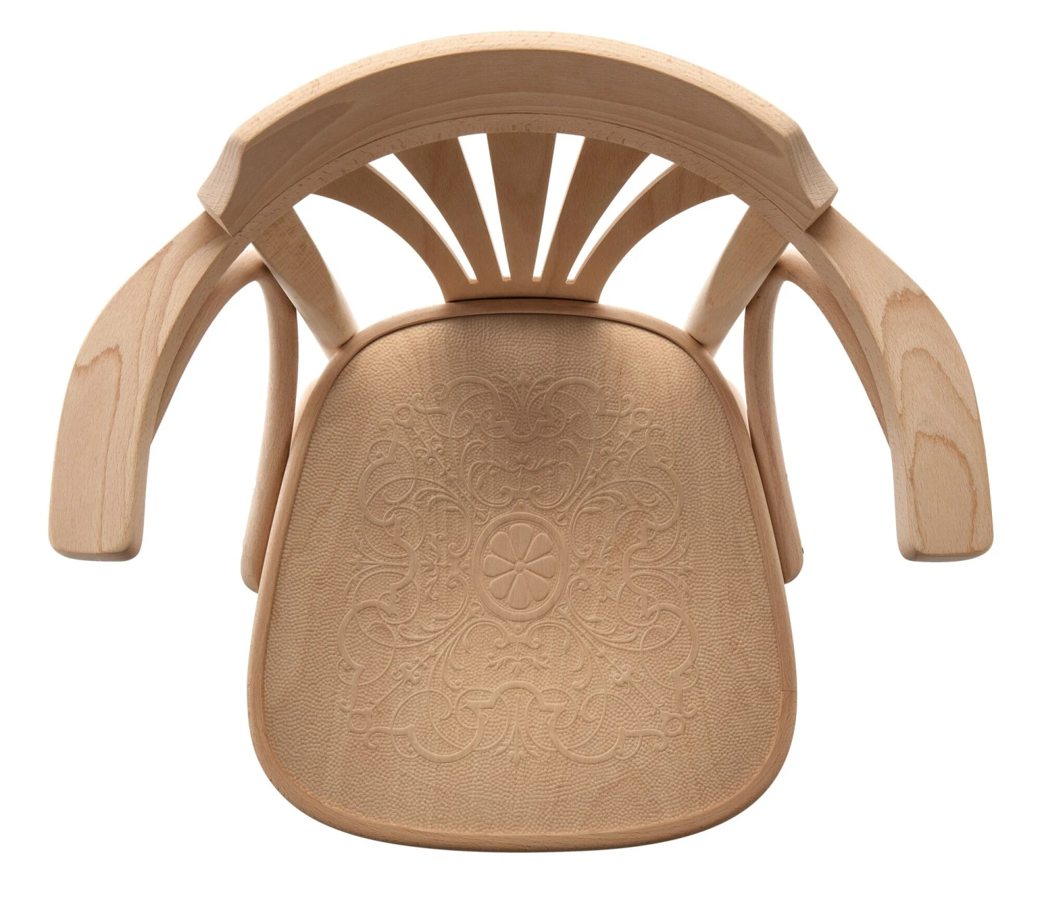 Wij bieden de gebogen houten stoelen zwart gelakt of braun gebeitst en blank gelakt aan. Hun zittingen zijn voorzien van reliëfpatronen die gebaseerd zijn op oude patronen – een techniek die, net als de vervaardiging van gebogen houten meubelen zelf, mechanische en industriële productie vereist.