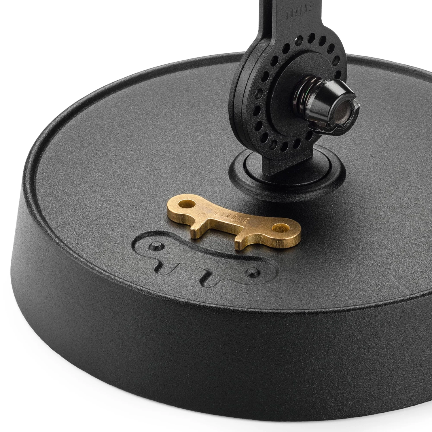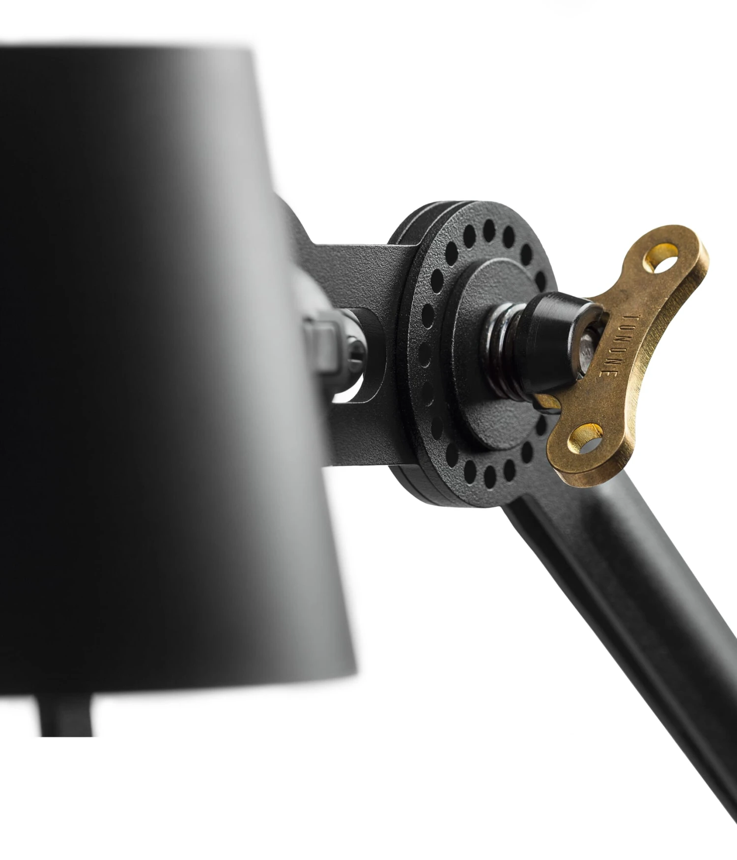 Alle modellen van de serie zijn opgebouwd uit identieke onderdelen die steeds worden herhaald. Dit begint bij de zware gietijzeren voet, vervaardigd in België, en strekt zich uit tot de stalen armsegmenten, die net als de aluminium kap zijn voorzien van een sterk reflecterende poedercoating. Elk scharnier kan vele malen worden versteld dankzij vijf stalen kogels tussen twee geperforeerde schijven met 23 gaten – maar alleen in hoeken die de vingers niet kunnen afknellen en de lamp niet doen kantelen. De bijgevoegde stelsleutel doet denken aan oude industriële armaturen. De Tonone-armaturen worden in- en uitgeschakeld via een drukknopschakelaar die zich net buiten de kap op de fitting bevindt. De lampenkappen zijn aan de boven- en onderkant open, waardoor zij neerwaarts licht op een te verlichten oppervlak kunnen schijnen en naar boven toe bijdragen tot een indirecte ruimteverlichting.