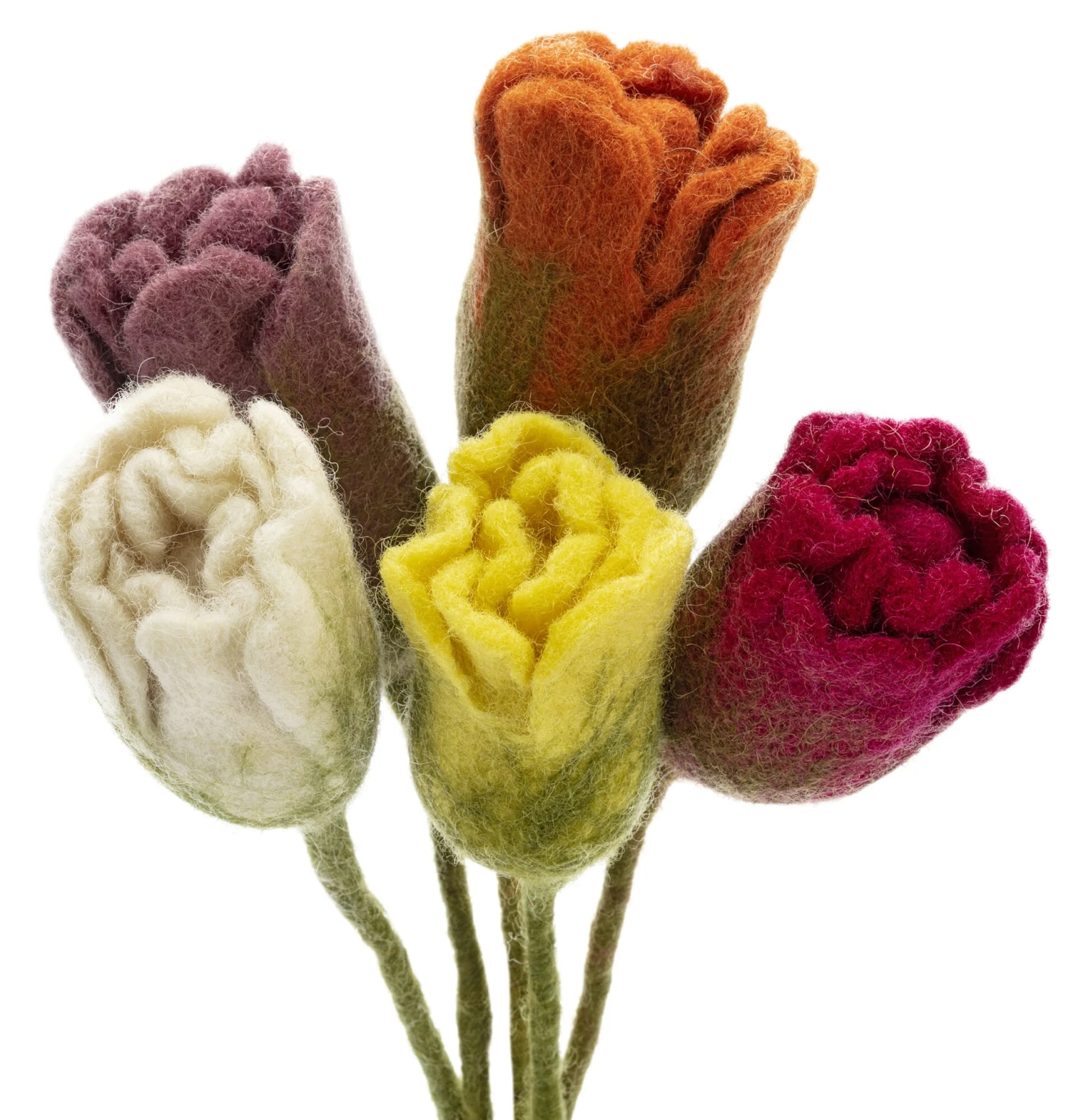 Set van 5 tulpen. Bloemen 100% scheerwol (herkomst Nieuw-Zeeland). Stengels draad, omwikkeld met scheerwol. Bloem elk Ø 4 cm, hoogte 8 cm. Totale lengte per bloem 34 cm. Gewicht per tulp 14 g. Levering zonder vaas en decoratie.