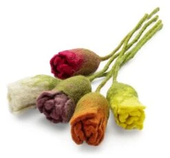 Tulpen uit Amsterdam zijn vergankelijk, maar deze zuivere wollen tulpen niet. Ver na de lente bevestigen ze uw liefdevolle genegenheid of brengen ze gewoon frisse kleur in uw inrichting. Deze tulpen van vilt, gemaakt van Nieuw-Zeelandse scheerwol, laten hun kopjes alleen hangen als je de met scheerwol omwikkelde stengel dienovereenkomstig buigt (wat het natuurlijke visuele effect vergroot). Het tulpenboeket is zuiver met de hand gemaakt en toont de kracht van kleur en vorm van zijn natuurlijke modellen – tot en met de bloemblaadjes, die zich nestelen tot de halfgeopende bloem. En als u de visuele weelde van een boeket snijbloemen wilt vergroten of op zoek bent naar decoratieve ideeën voor de zondagse tafel en cadeauverpakkingen, bieden vilten tulpen een extra vleugje kleur.