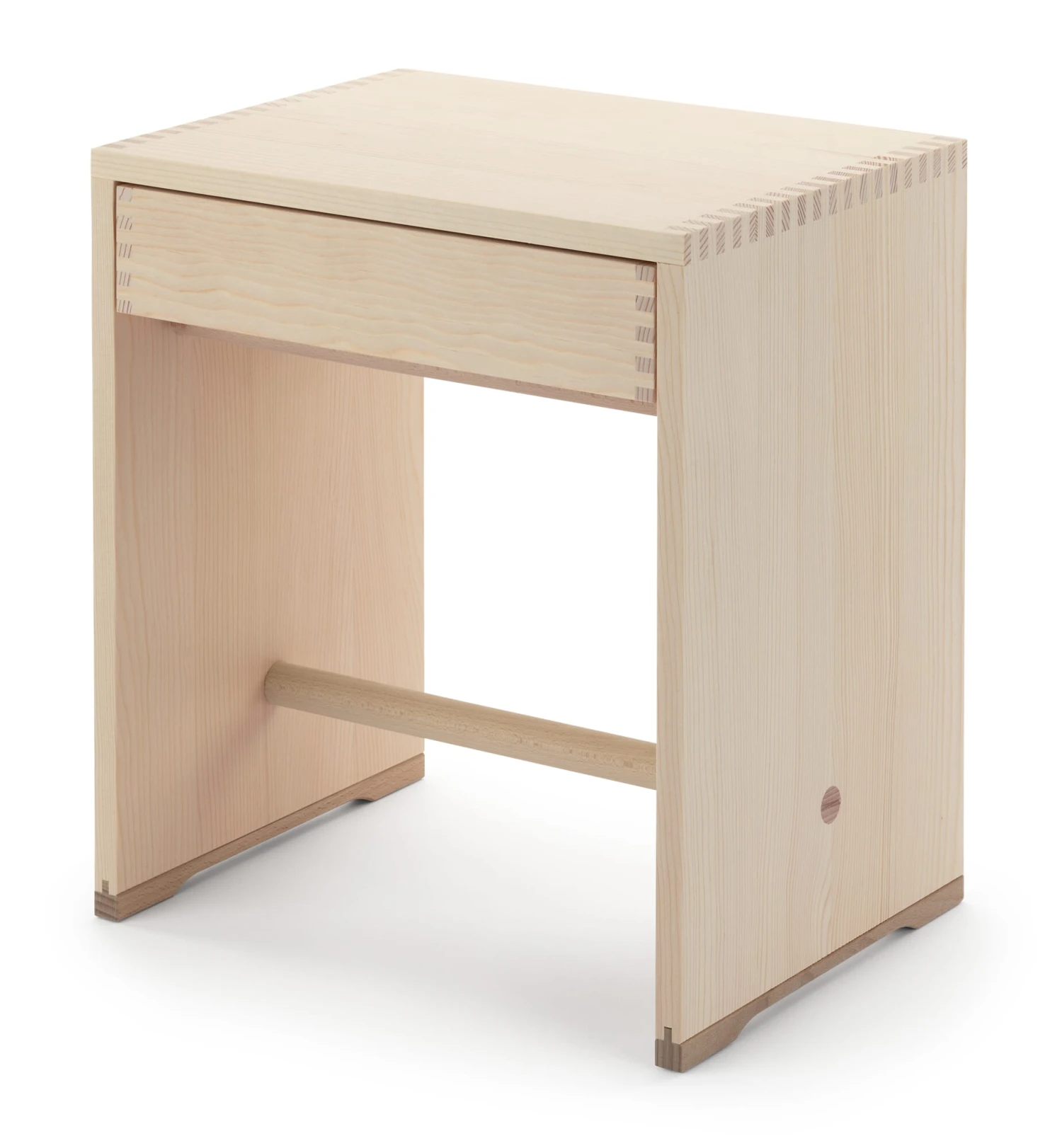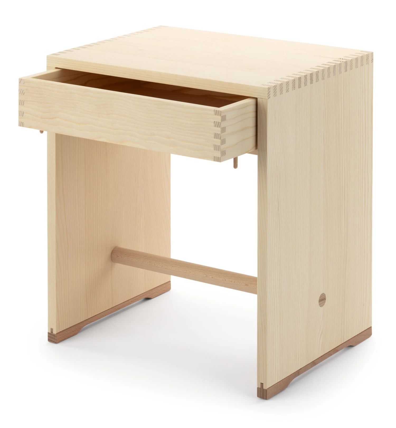 Net als de kruk zelf is deze lade gemaakt van onbehandeld vurenhout, heeft hij ingekerfde randen en is hij voorzien van een eenvoudige maar doeltreffende uittrekstop. Hoewel dit de kruk zijn oorspronkelijke functie als boekenkast ontneemt, die in de praktijk zelden voorkomt, past hij merkbaar beter in zijn rol als nachtkastje en bijzettafeltje, die hij in de loop der decennia heeft aangenomen.