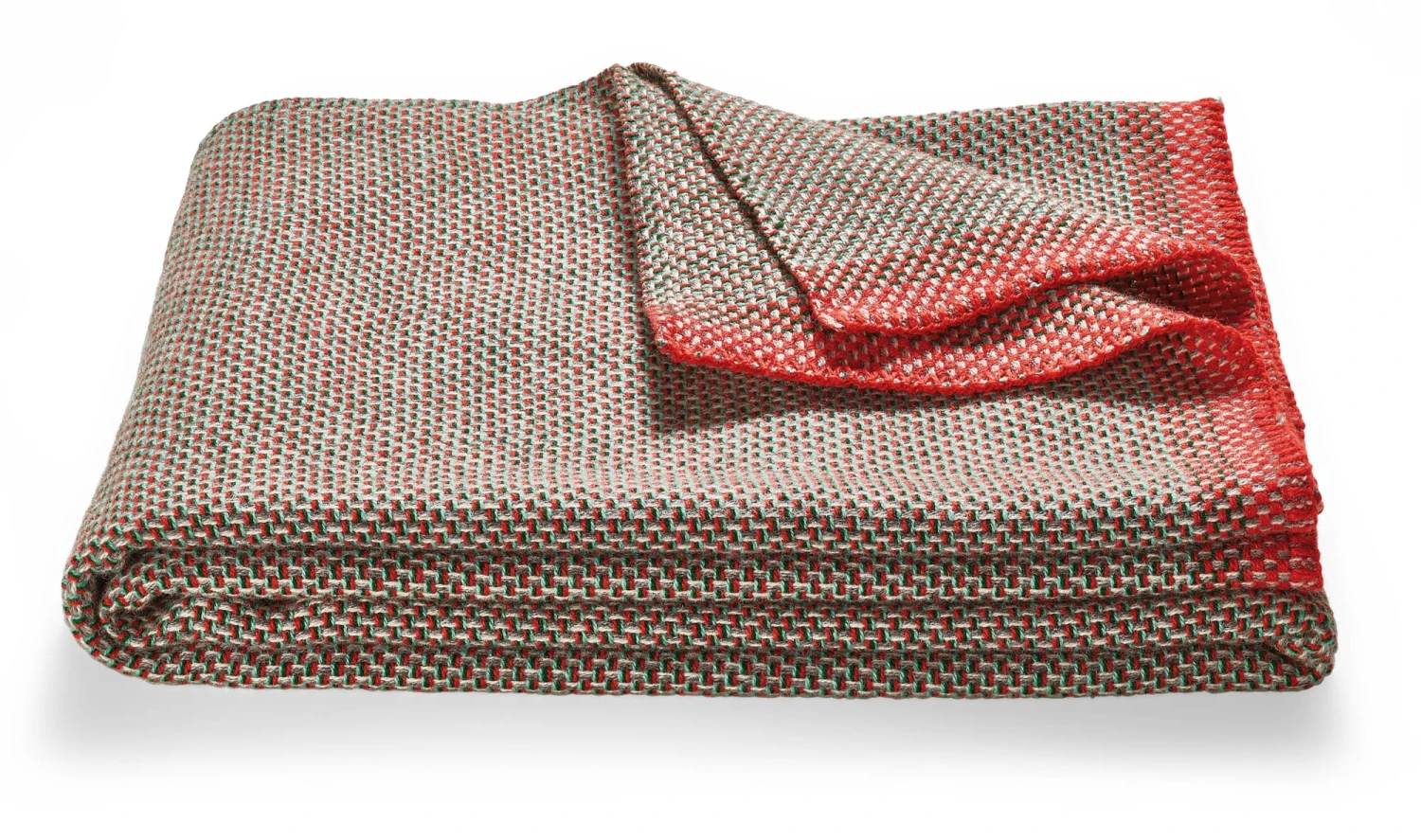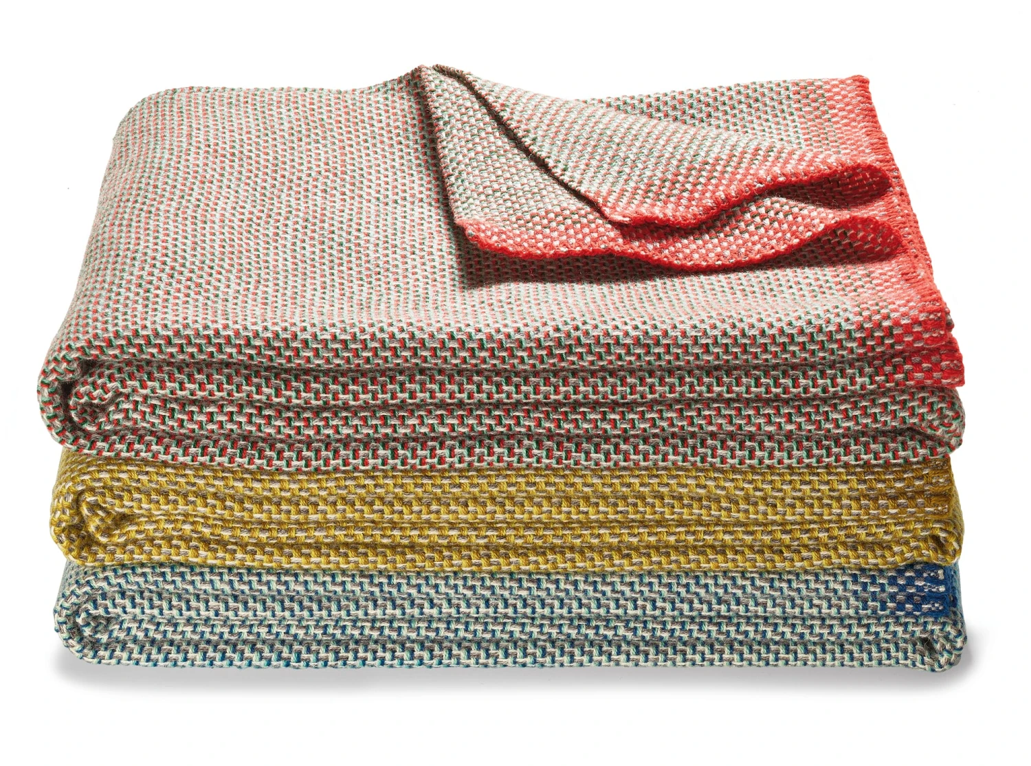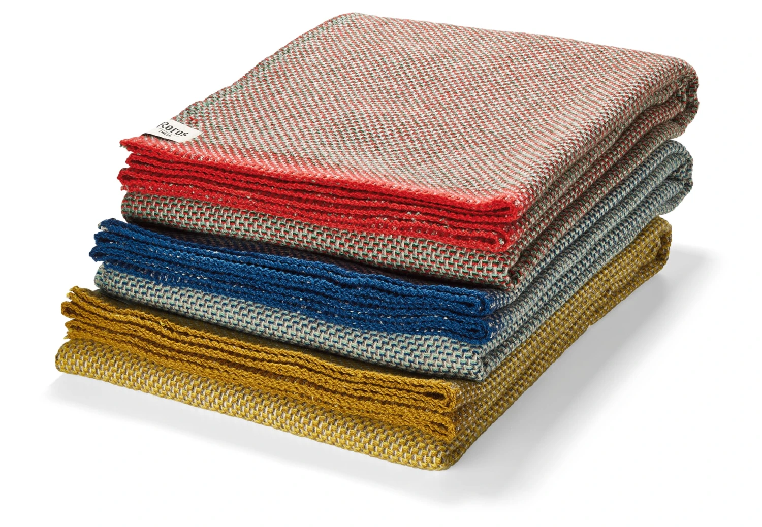 Deze deken is geweven in de zogenaamde Panamabinding, waarbij verschillende parallelle draden in schering en inslag worden geweven om een soort schaakbordpatroon te creëren. Hier liggen drie draden naast elkaar. De speciale functie: Er worden telkens drie kleurschakeringen gebruikt. De schering bestaat uit drie draden in grijstinten, de inslag uit drie verschillend gekleurde draden of, in het geval van de geelgrijze deken, uit drie tinten geel. Van een afstand gezien lijken schering en inslag monochroom, maar pas van dichtbij worden de gradaties zichtbaar. Het symmetrische weefsel en de trilogie van kleuren zorgen voor een levendig, maar uniform kleurenspel. De korte zijden van de deken zijn gebonden met bijpassend wolgaren.