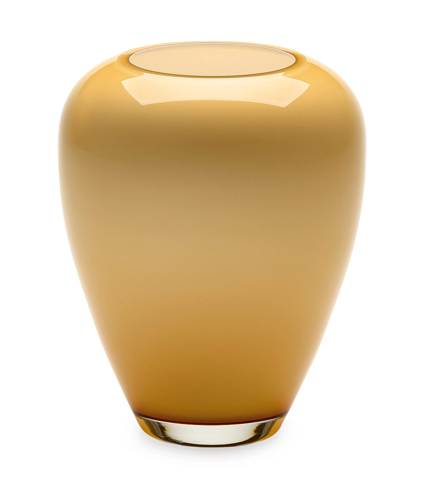Voor grotere boeketten, snijbloemen met lange stelen of enkele takken. Handgeblazen in overlay techniek. Opaalwit van binnen, honinggeel van buiten. Hoogte 26,5 cm, 21,5 cm Ø. Gewicht 2,9 kg.