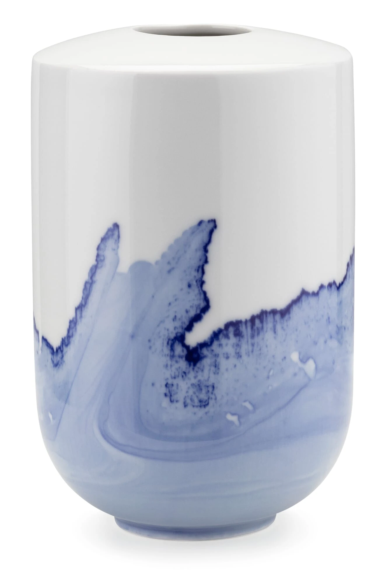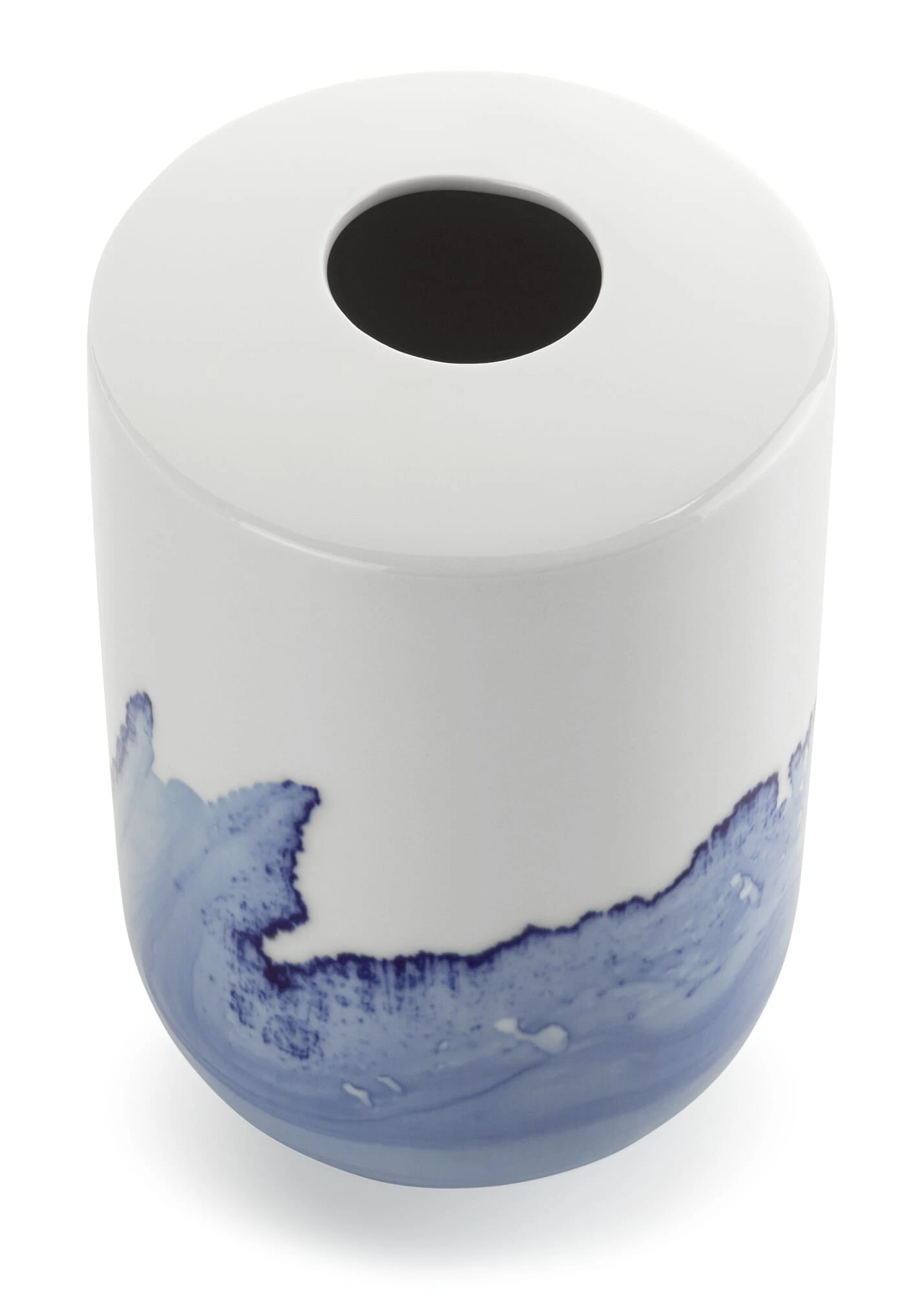 Voor deze porseleinen vazen werkt de in Berlijn gevestigde, meervoudig bekroonde ontwerpster samen met de Thüringse porseleinfabrikant Kahla. Het traditionele bedrijf, dat produceert op een manier die zoveel mogelijk hulpbronnen spaart – bijvoorbeeld door gebruik te maken van een proceswaterzuivering en een fotovoltaïsch systeem – heeft naam gemaakt met zijn hoogwaardig, fijn, zuiver wit hard porselein. Zodra het zorgvuldig gevormde, dubbelgebakken (op 900 °C en 1.400 °C) porselein uit de oven is, afgekoeld en klaar voor verdere verwerking, brengen Badur en haar team het ontwerp vakkundig met de hand aan. Dit maakt van elke Tide-vaas een uniek exemplaar, dat het arrangement van uw takken en bloemen onderstreept met kobaltblauwe rimpelingen.