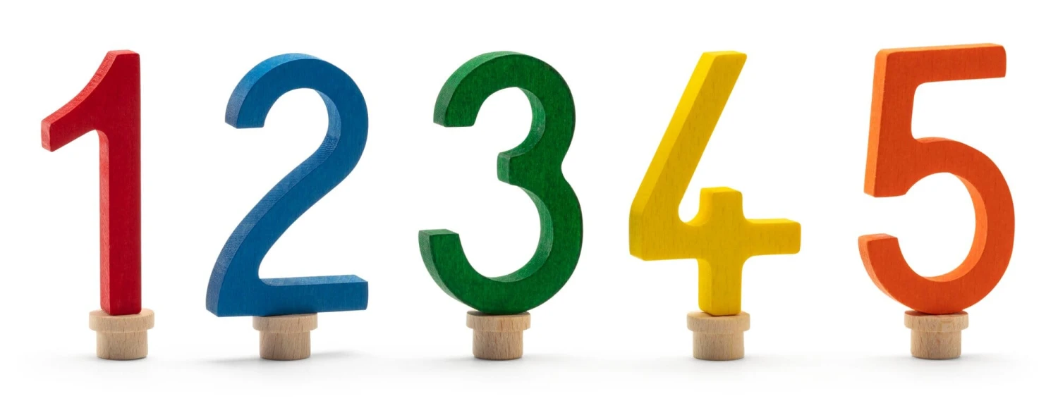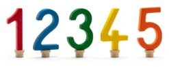 Beukenhout, kleurrijk geglazuurd en gebeitst. Elk één cijfer in de kleur rood, blauw, groen, geel en oranje. Hoogte van de cijfers 7 cm, houtdikte 1 cm. Gewicht 50 g.