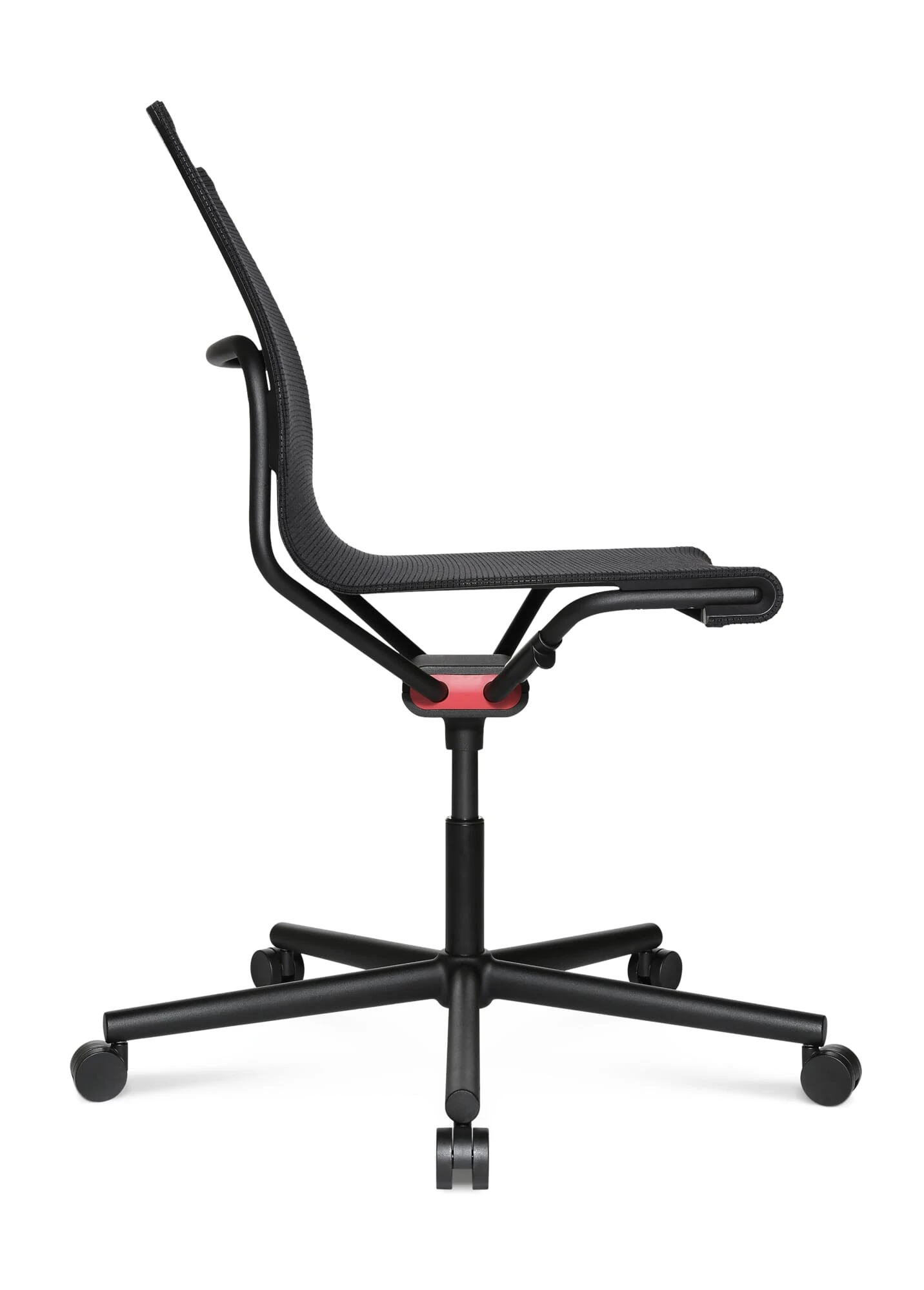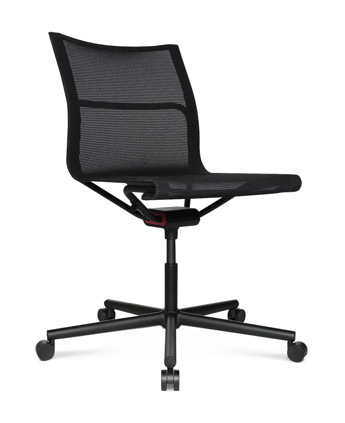 Werkstoel D1 – zonder armleuning – met het beste comfort, filigraan van constructie, minimaal materiaalgebruik. In hoogte verstelbaar en met zachte wielen (voor harde vloeren) op het vijfpotige frame.