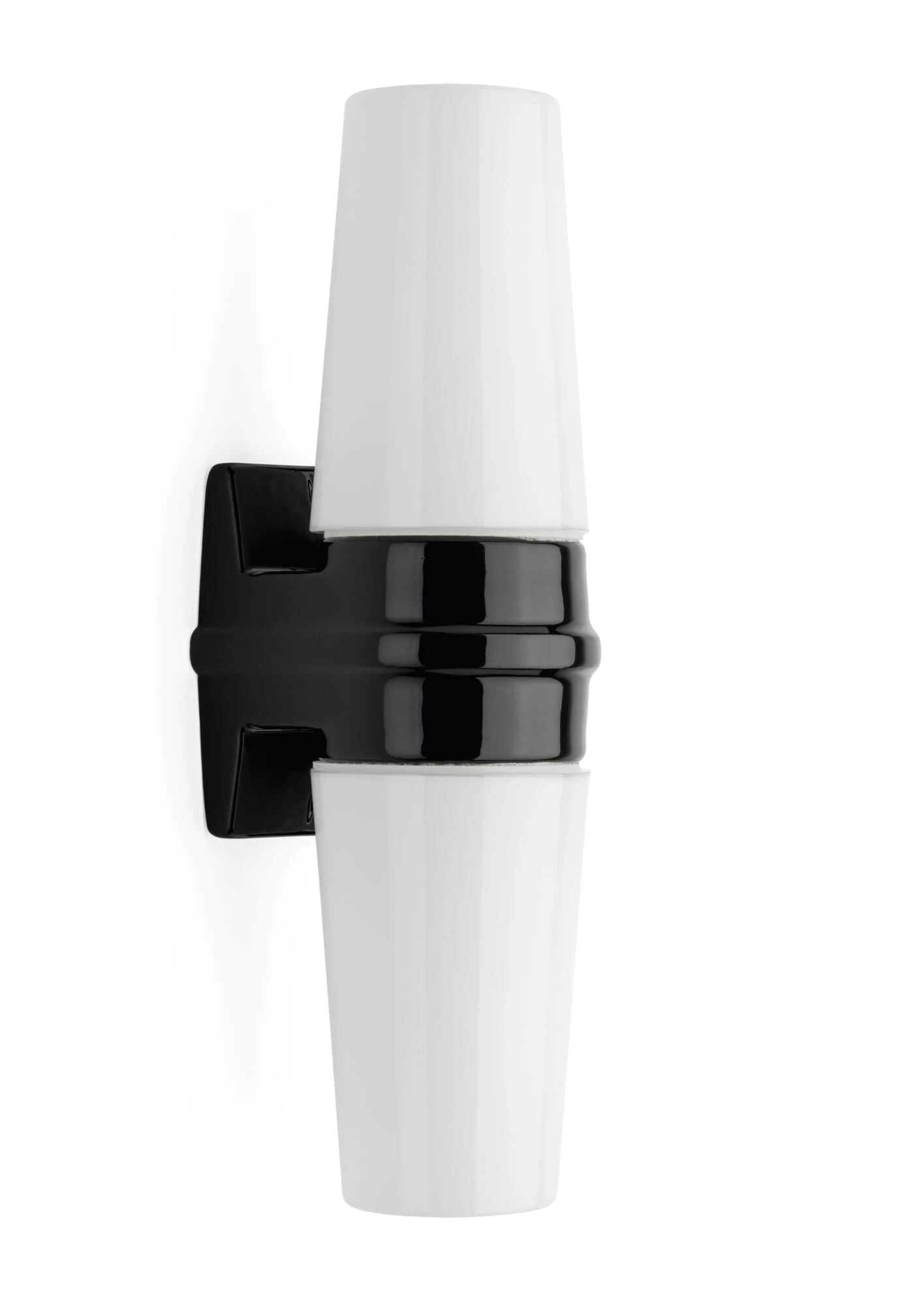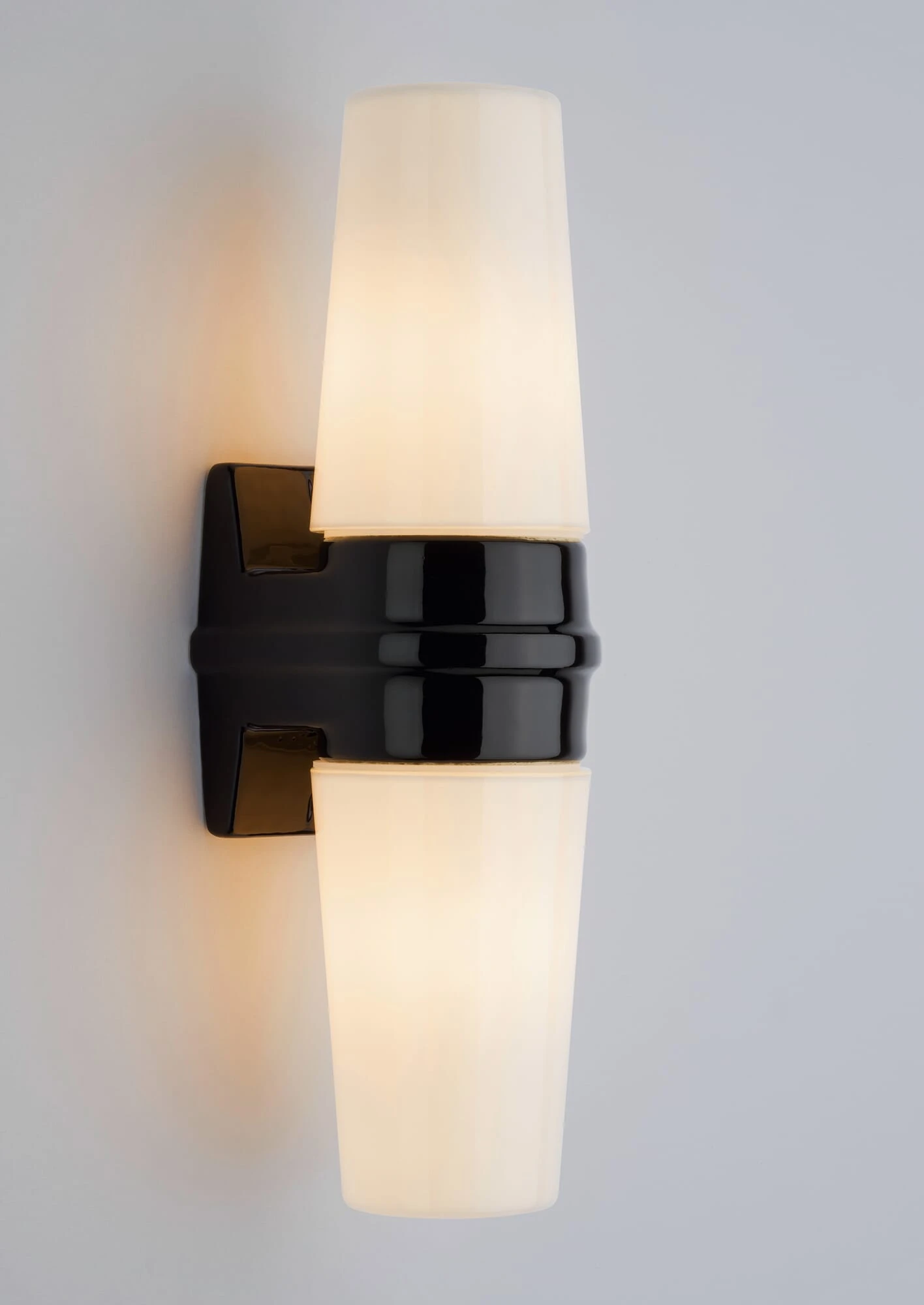 Deze wand- en spiegelarmatuur van keramiek en opaalglas, geschikt voor vochtige ruimtes, werd in 1965 ontworpen door de Zweedse ontwerper Sigvard Bernadotte. Hij is zowel geschikt voor verticale als voor horizontale montage.