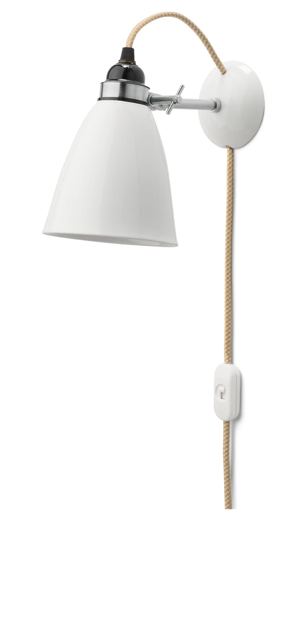 De kap van deze wandlamp is gemaakt van bone china, de wandrozet van porselein. De lamp wordt in- en uitgeschakeld via een tussenschakelaar van kunststof die in de textielkabel wordt gestoken.