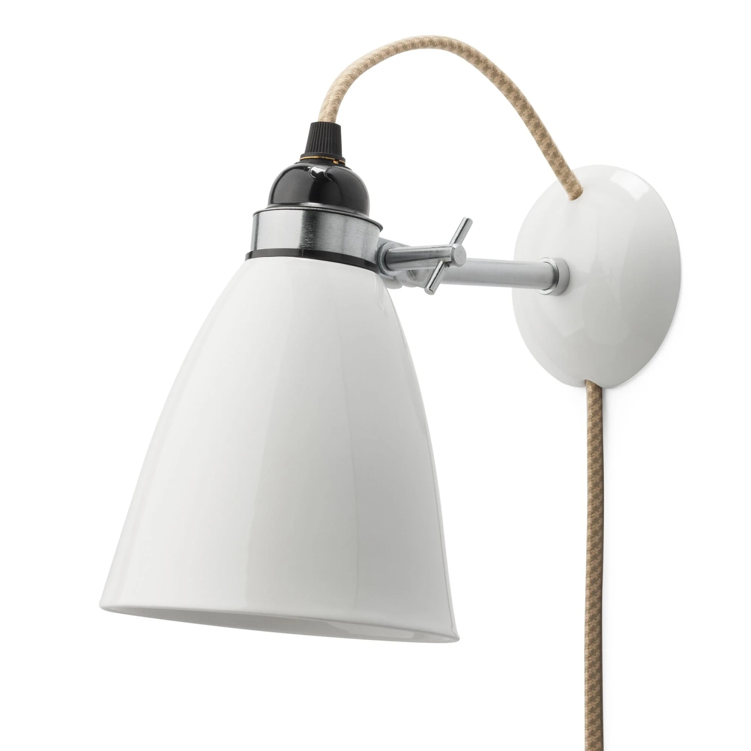 Met kabel. Tussenschakelaar en stekker. Porseleinen muurrozet, Ø 8,5 cm. Textielkabel, lengte 2,2 m, eurostekker. Projectie max. 26,5 cm. Gewicht 660 g.
