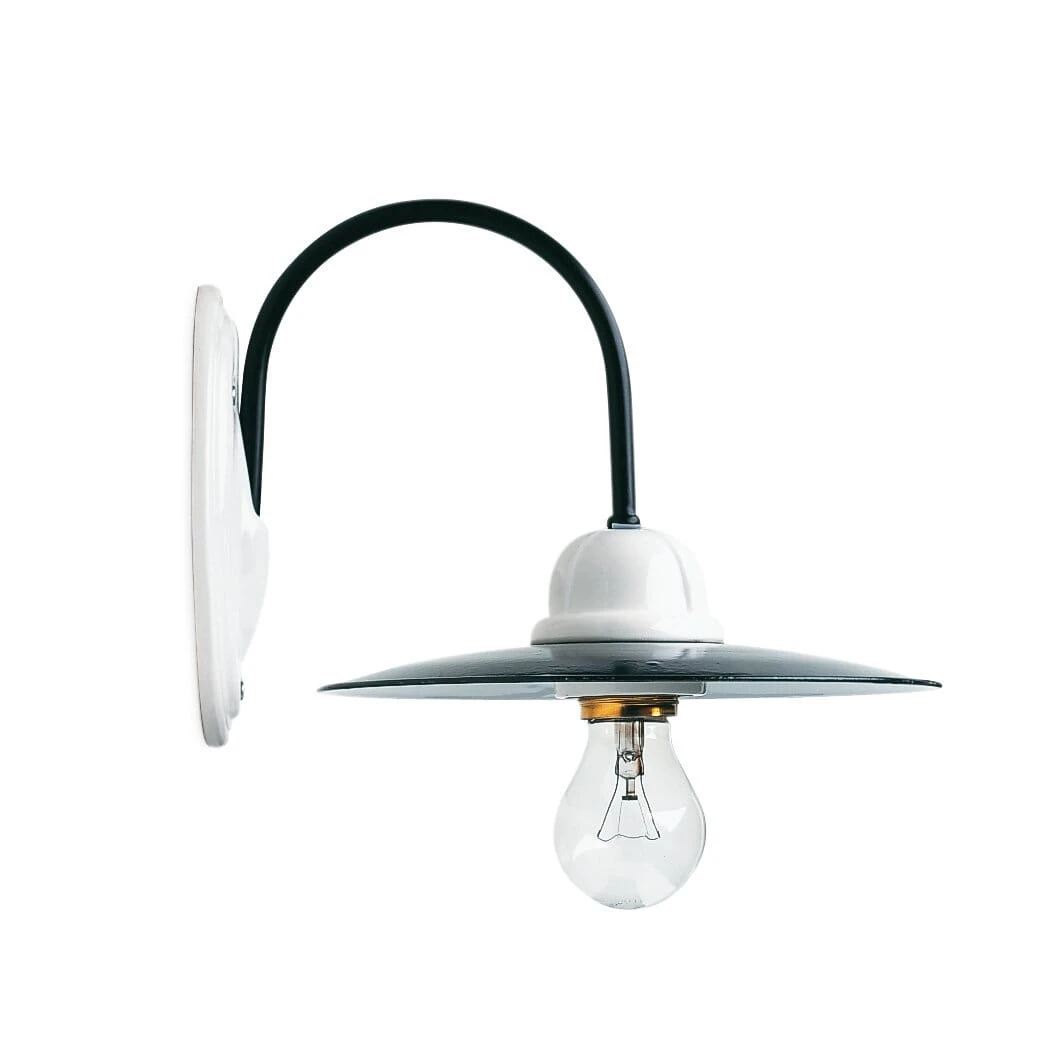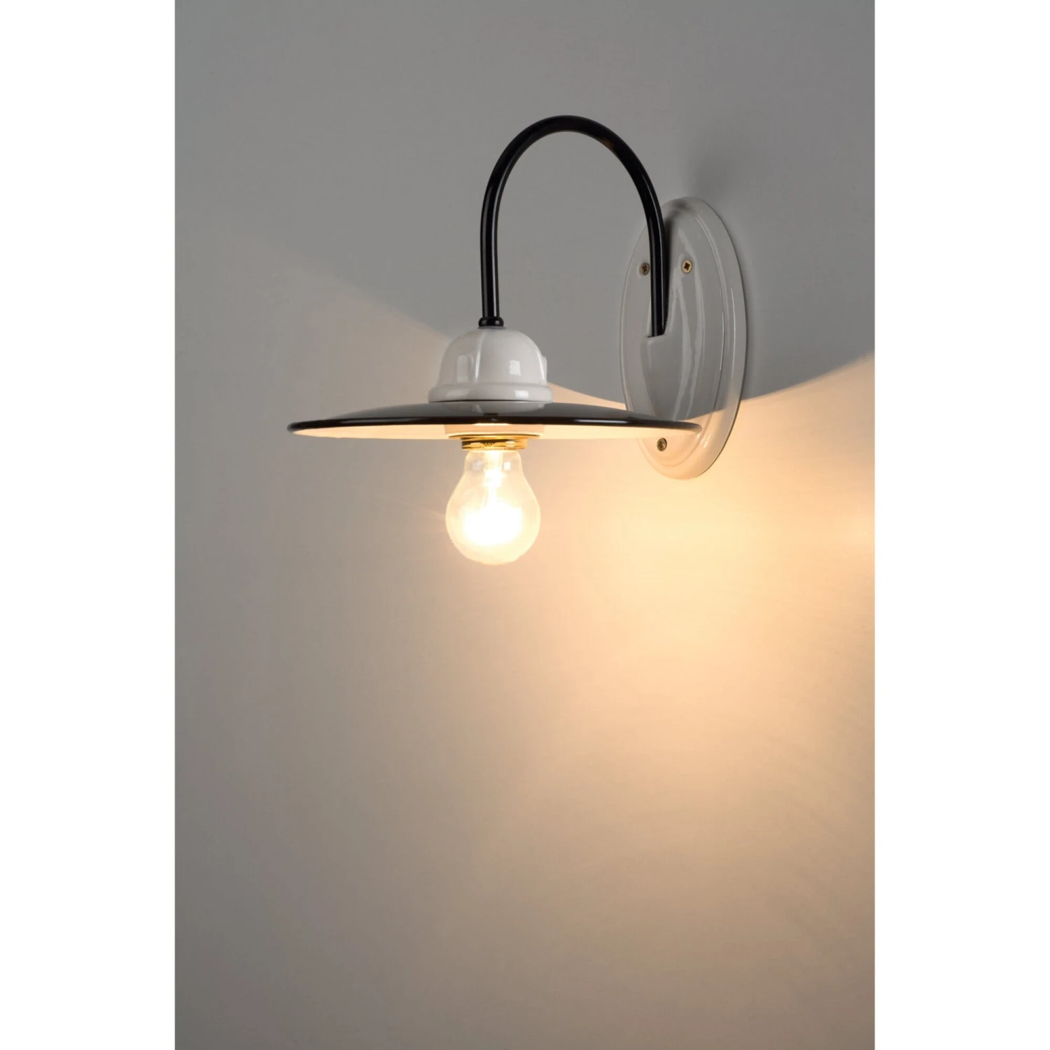 Kap van plaatstaal, buitenkant zwart, binnenkant wit geëmailleerd, Ø 24 cm. Ovale keramische wandrozet en geëmailleerde arm. Hoogte 23 cm, uitsteeksel 30 cm. Metalen contactdoos E 27 (max. 75 W) met keramische tegenring. Gewicht 740 g. Gemaakt in Italië. Levering zonder verlichting.