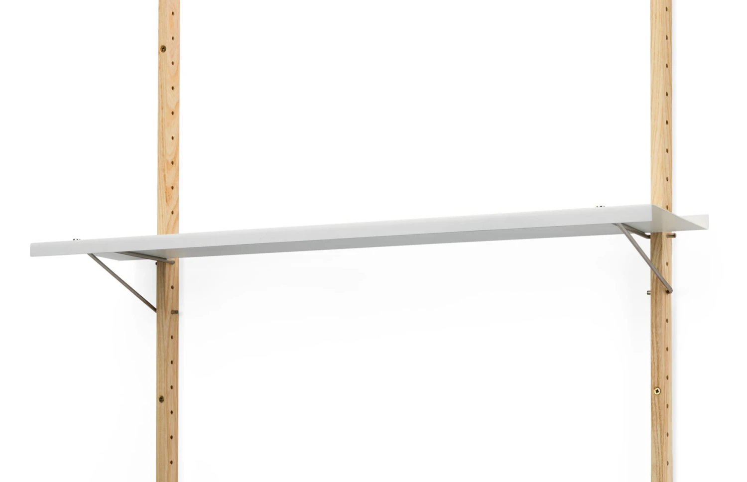 Filigraan wandrek voor boeken, het privékantoor of ook in de keuken en badkamer. RM3 vertoont een perfecte materiaaleconomie – basis van plaatstaal, beugel van roestvrij staal en een massief houten profiel – deze drie materialen komen in dit product op ideale wijze samen. Het ontwerp is gebaseerd op een slim gebruik van de respectieve eigenschappen van de materialen. De uiteinden van de multi-gebogen plankdrager van roestvrij staaldraad grijpen in het houten wandprofiel en verbinden het verticale profiel en de horizontale plank met een minimaal materiaalgebruik. Het RM3 basisrek bestaat uit twee wandprofielen van massief essenhout, drie 20 cm diepe legborden en de nodige montagetoebehoren. Het schap kan worden uitgebreid met behulp van extra schappen die apart verkrijgbaar zijn – ook in een diepte van 30 centimeter – evenals boekensteunen van roestvrij staaldraad. De combinatie van twee RM3 boven elkaar resulteert in een quasi kamerhoge plank, waarbij de houten profielen die aan hun uiteinden schuin zijn verbonden, perfect in elkaar passen. De maximale belasting van een plank is 15 kilogram.