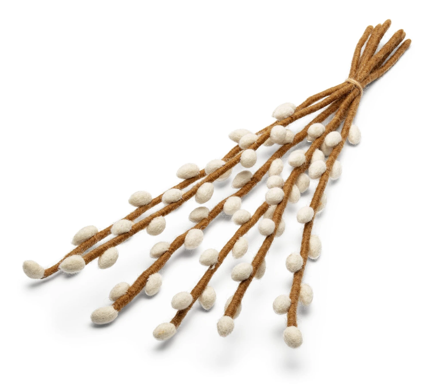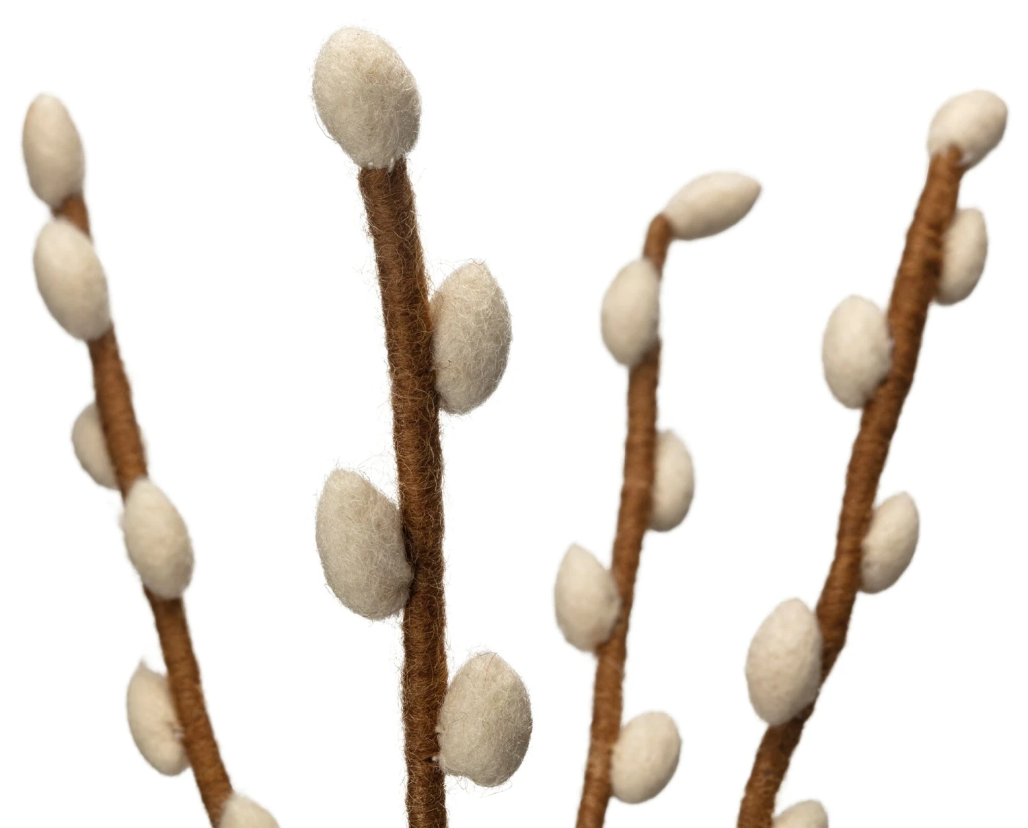 100% scheerwol (herkomst Nieuw-Zeeland). Stengels draad, omwikkeld met scheerwol. Set met in totaal 6 wilgenkatjes. Elke bloem H 1,5 × B 1 cm. Totale lengte per tak 40 cm. Totaal gewicht 55 g. Levering zonder vaas en zonder decoratie.