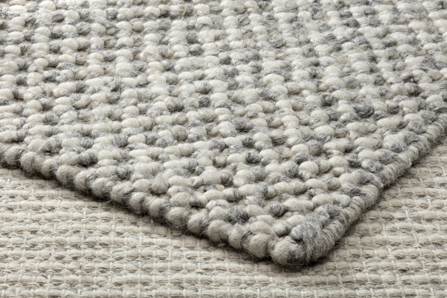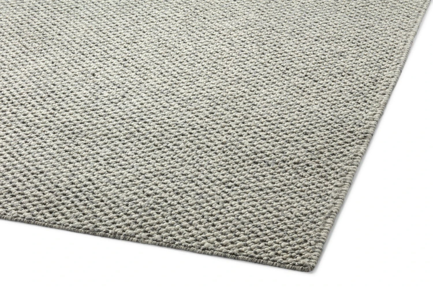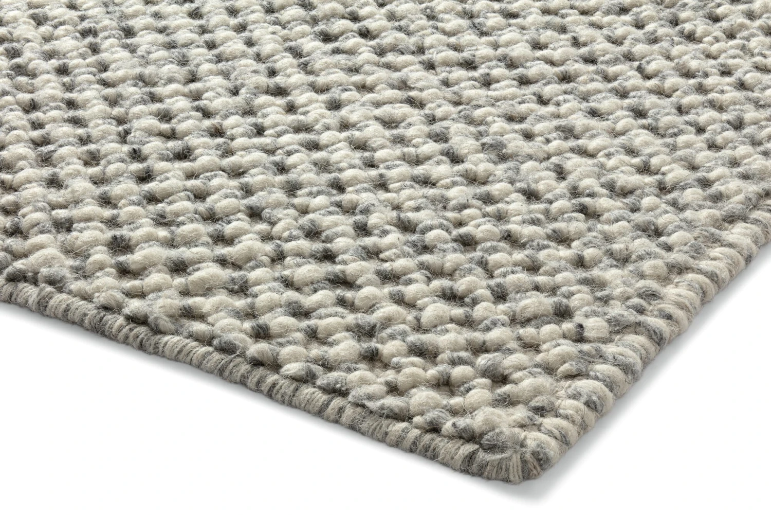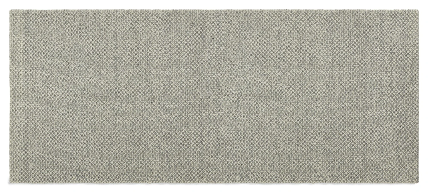 Het speciale weefsel maakt van de zachte scheerwol een stevig, volumineus tapijt van een centimeter dik. Voor de schering wordt sterk katoengaren gebruikt en in de inslag vormt het dikke wolgaren hier en daar “bobbels” of noppen, waardoor een opvallende structuur ontstaat die aangenaam zacht aanvoelt onder de voeten. In combinatie met de gevlekte grijstinten levert dit een mooi, levendig oppervlak op. Toch past het tapijt goed bij elke woonstijl – of het nu minimalistisch en Scandinavisch helder is of kleurrijk speels.