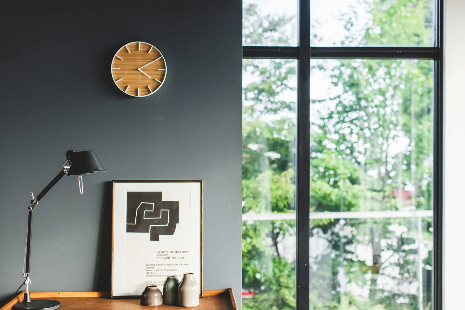 Delicate wandklok in een ongebruikelijke combinatie van materialen. De kast, uurmarkeringen en wijzers zijn van staal, de wijzerplaat bestaat uit een fijne fineerlaag van walnoot of essenhout. Met stil tikkend quartz uurwerk voor 1 AA batterij (niet inbegrepen).
