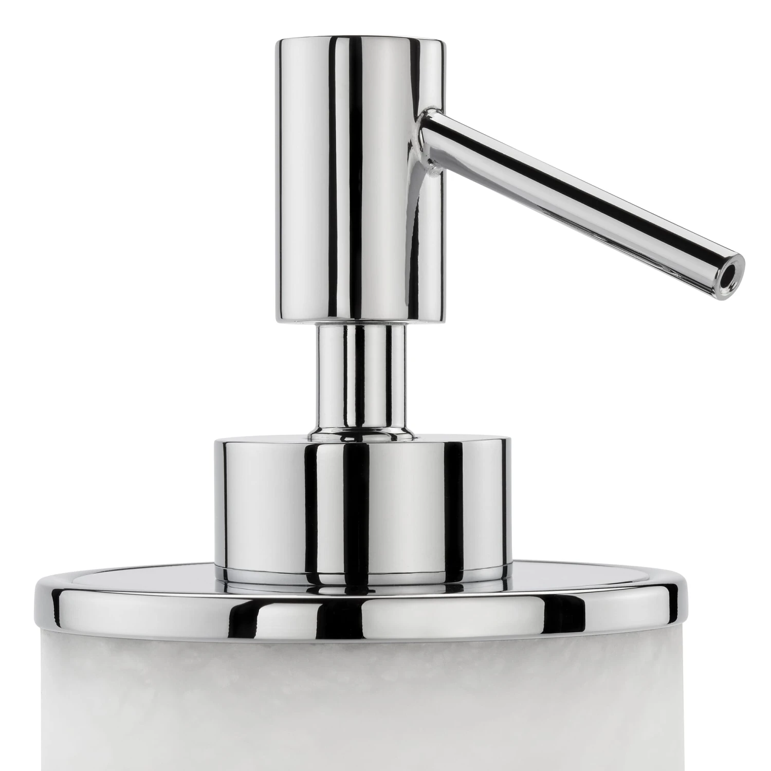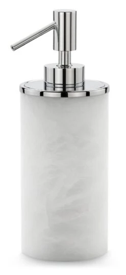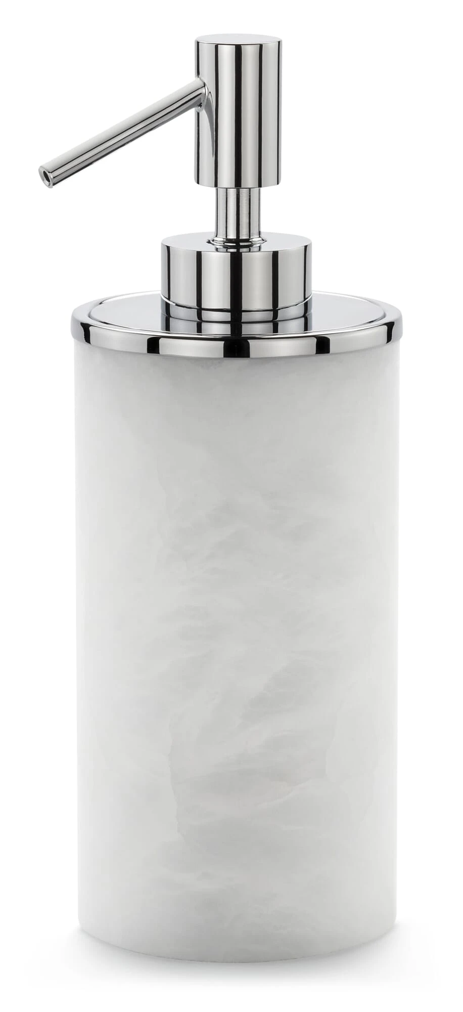 Zeepdispenser in albast en verchroomd messing. Deksel verchroomd messing. Zeeptank van geperst glas. Zuigslang en voeten in plastic. Gemaakt in Spanje. Schoonmaken met een vochtige doek, geen schurende, zure, blekende of chemische schoonmaakmiddelen gebruiken