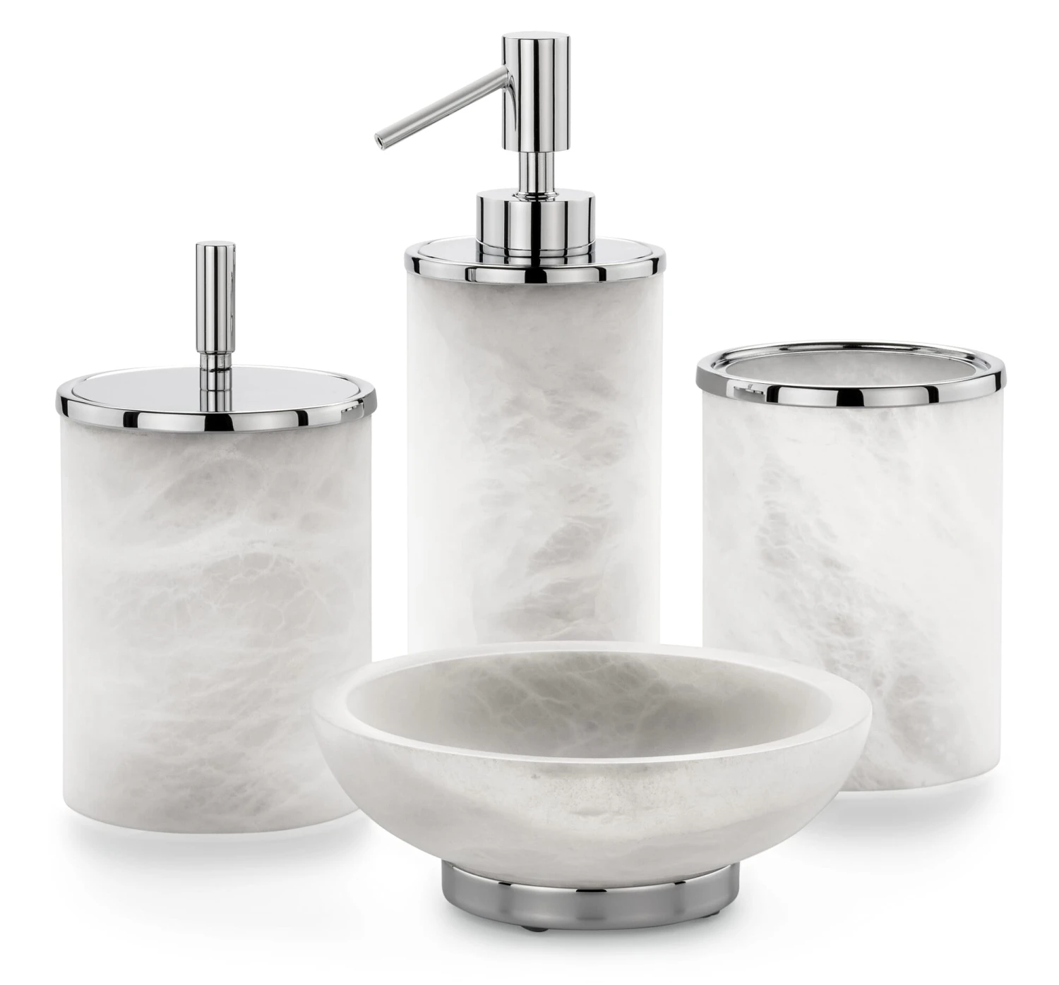 Elk stuk is uniek. Badkamerbenodigdheden van albast