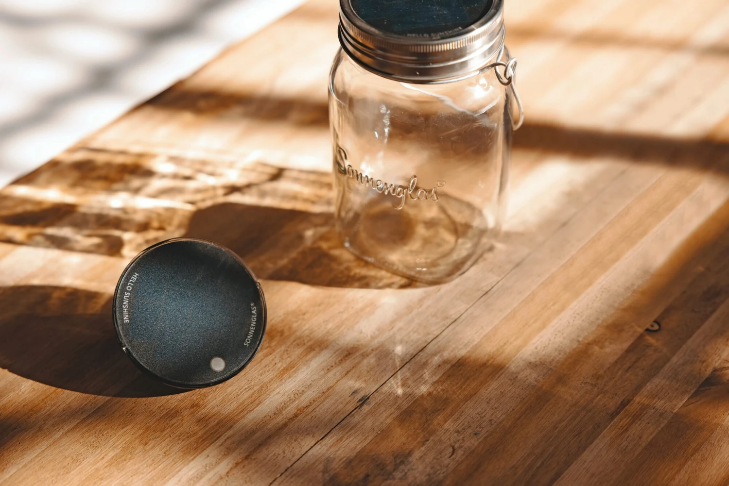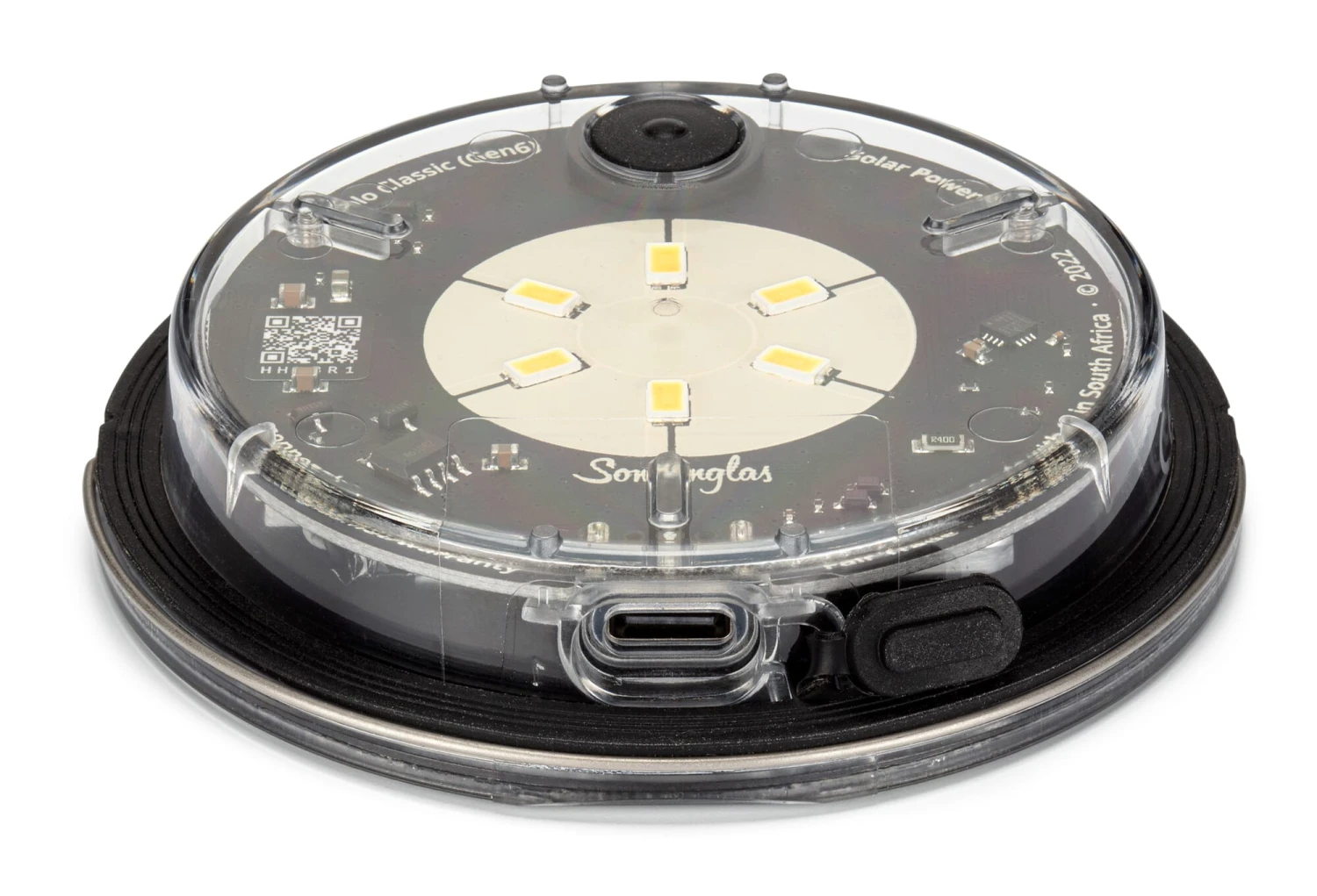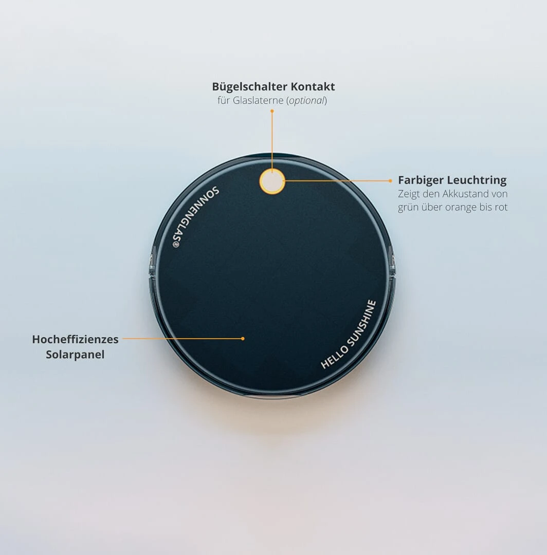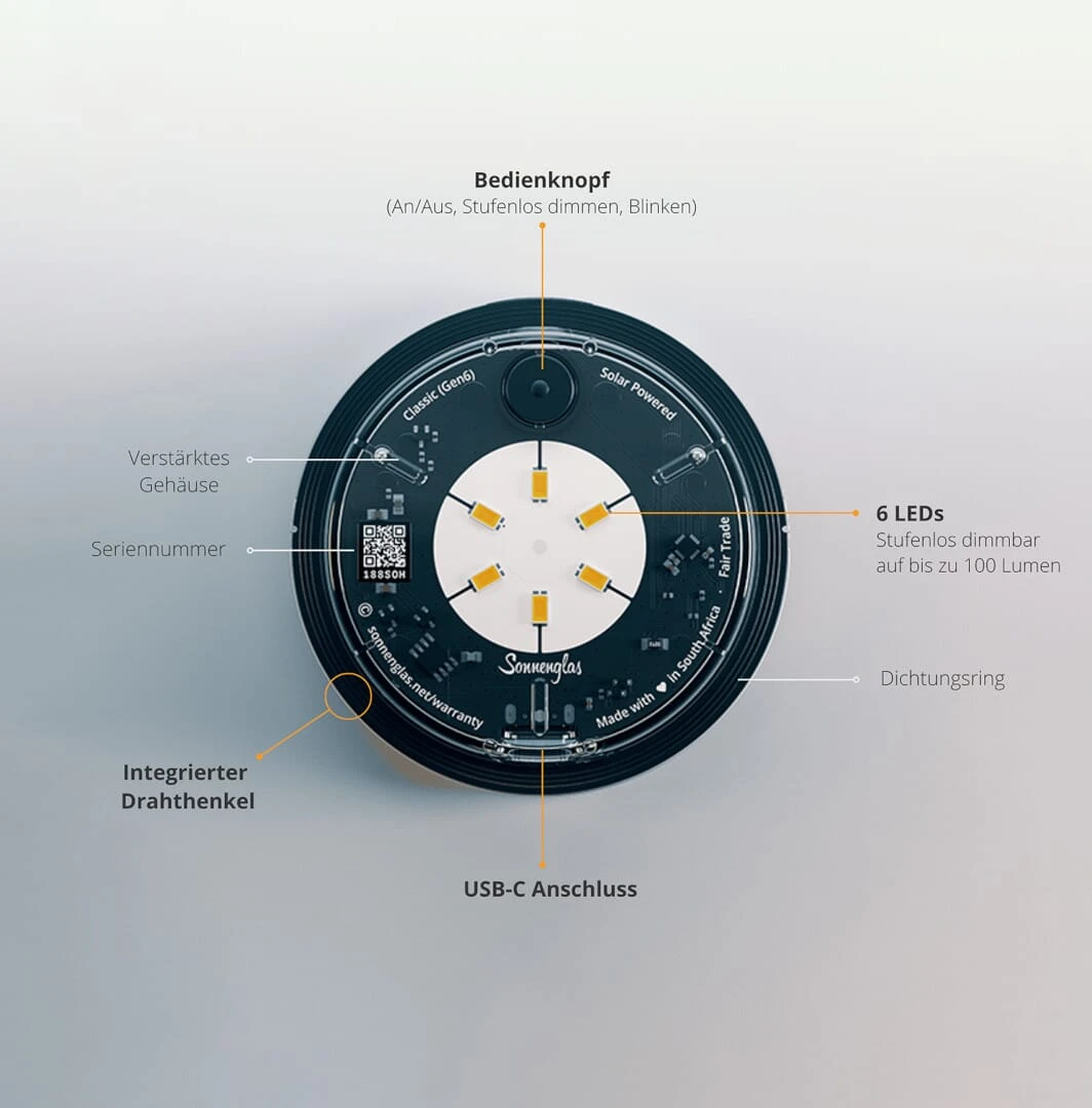 De zonnemodule van de SONNENGLAS® -tafellamp is ook zonder glasbak volledig functioneel. Hij kan worden gebruikt als kleine handlamp en past in elke broekzak. Het kan ook worden gebruikt om het SONNENGLAS® -effect te creëren met vele andere glazen verpakkingen. Hij kan worden in- en uitgeschakeld via de bedieningsknop en heeft ook een noodlichtfunctie waarbij de LED’s knipperen. Deze technisch geavanceerde versie heeft een extra schakelaar, een laadniveau-indicator en is bovendien dimbaar en spatwaterdicht. Voor het extra opladen van de batterijen is er een USB-C-stekker met snelladen in de armatuurunit: 10 uur verlichtingstijd na slechts 10 minuten opladen. Beschermingsklasse: IP67. Lichtduur tot 100 uur na elke volledige lading. Technische gegevens van de vier ingebouwde LED’s: lichtstroom: traploos dimbaar tussen 5 en 100 lumen, kleurtemperatuur: 3.000 K (zacht, warm, flikkervrij licht), levensduur: 25.000 h, nominaal vermogen: 120 mW. 1 × zonnepaneel (3 V, 135 mA) en 1 × Li-Ion batterij (3,7 V, 600 mAh) zijn inbegrepen.