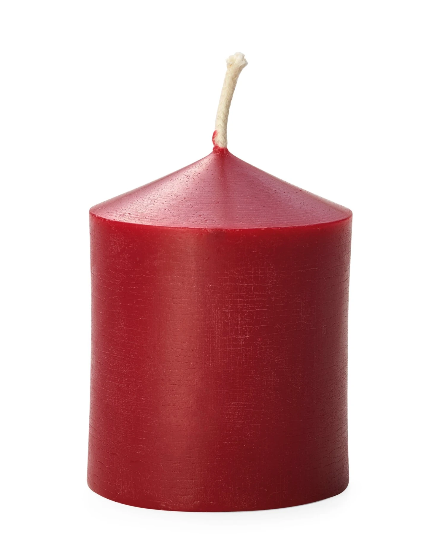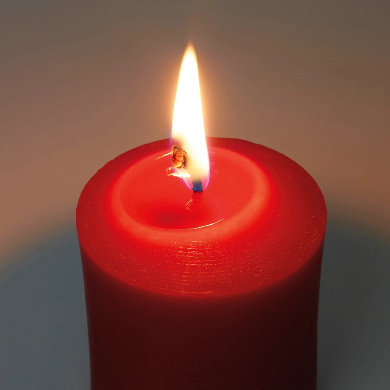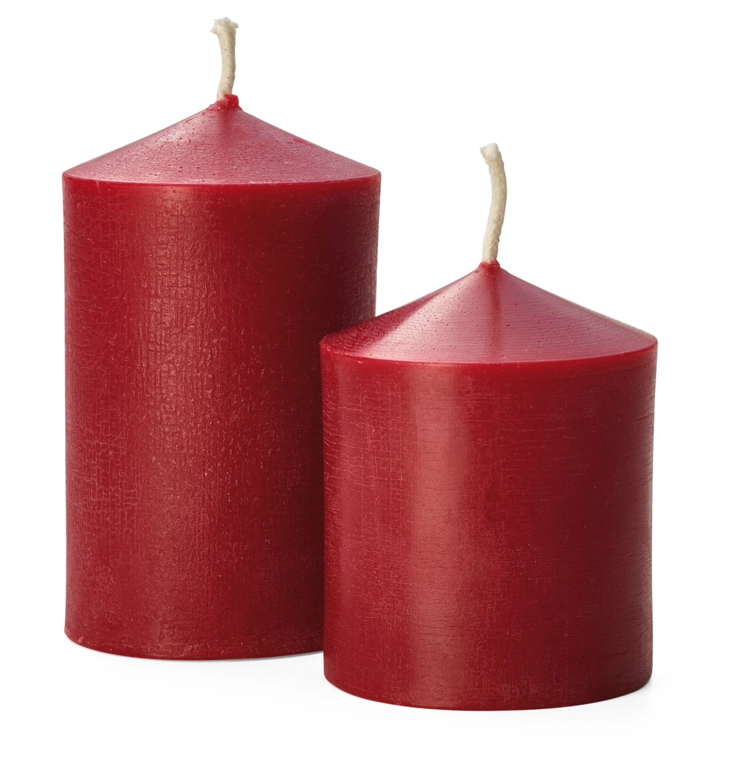 Advent- en bloemschikkaars van 100% bijenwas, doorgekleurd met rode pigmenten. Katoenen lonten. In twee maten.